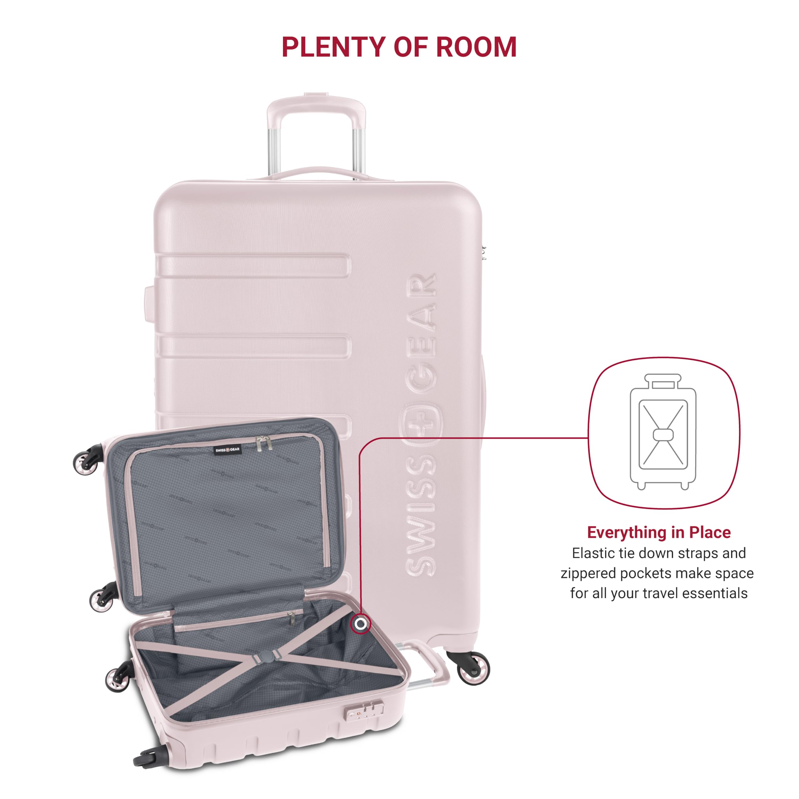 Description Travel in style with the SwissGear Signature Expandable Hardside Luggage Set. Both modern and utilitarian, its lustrous metal zippers and rugged construction exemplify its long-lasting quality. The set contains the 19” Carry-On and a 27" Expandable Hardside Luggage. Its almost indestructible split case opens to display the main compartment equipped with tie-down clothing straps, a roomy zippered lid pocket, and a large zippered packing pocket to keep your travel-sized essentials separate from your clothes. It also includes a premium steel locking handle, four 360-degree wheels, expandable packing space, and a molded grab handle. Guaranteeing extra security with its built-in TSA-approved three-dial combination lock, make this a go-to for your upcoming voyage because, whether traveling for business or pleasure, this is doing adventure the right way.