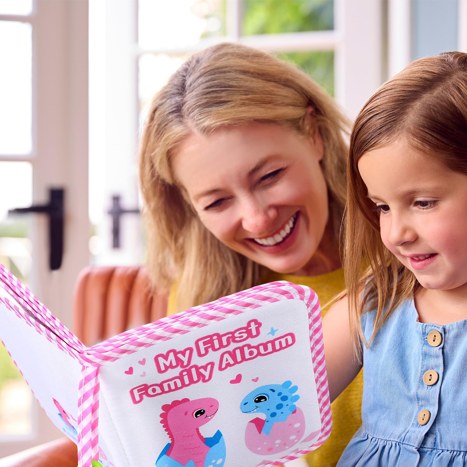 Practical and Safe Design: my first pink dinosaur eggs family cloth book photo album with baby safe mirror and 30 name stickers, this dinosaur eggs themed baby photo book adds a touch of fun while ensuring a safe environment