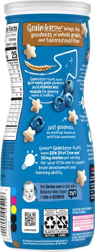 Nourish your little one with whole grain goodness by serving Gerber Graduates Puffs Cereal Snack at snack time. Gerber Graduates Puffs Cereal Snack have 2 grams of whole grains per serving, and 5 vitamins and minerals making them an ideal snack for your older baby learning to self feed. Gerber Graduates Puffs Cereal Snack are easy to chew and swallow and are just the right size for little hands to pick up and enjoy.