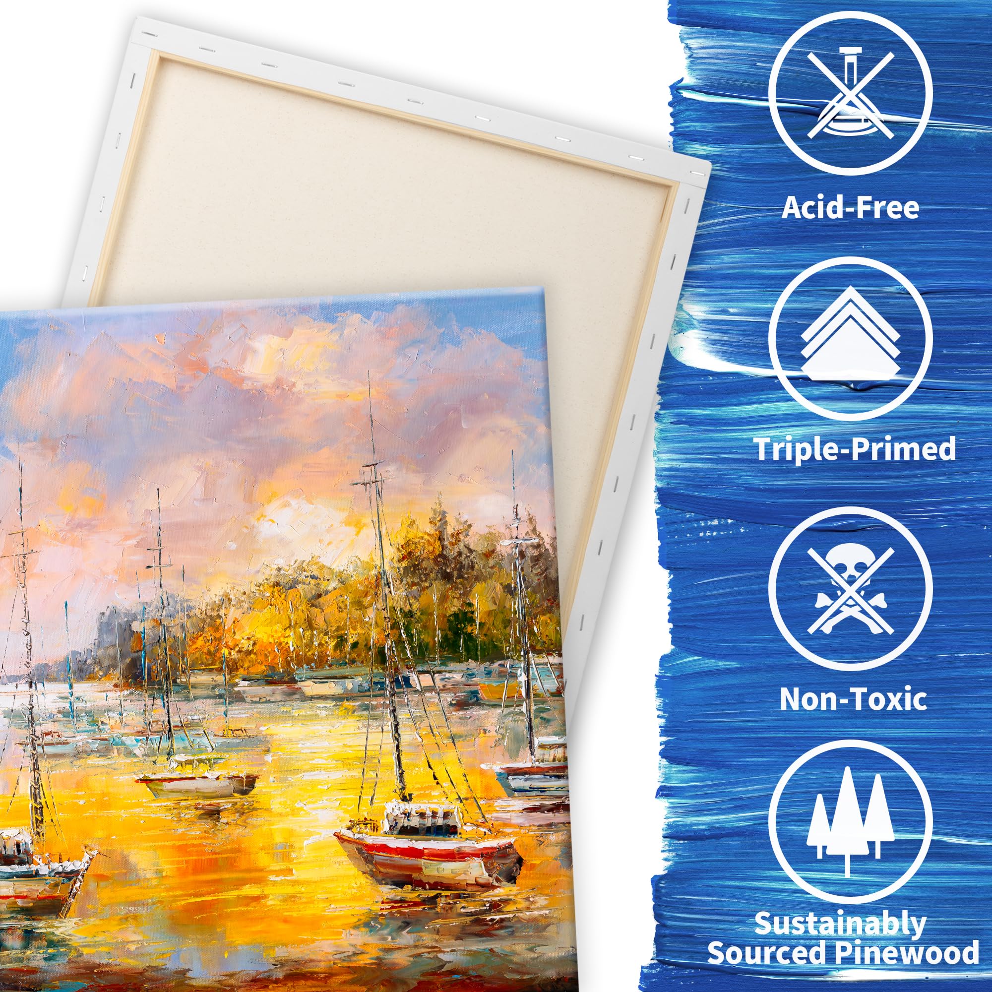 TRIPLE PRIMED GESSO: Does not crumble or crack.Each large stretched canvas in this set is pre-coated with 8 oz. of acid-free acrylic gesso. So you can start painting and creating as soon as you remove the wrapper. Suitable for oil, acrylic and other painting media. BOARD SIZE – 16x20 inch 5/8" Thick Super Valued 5 PACK.