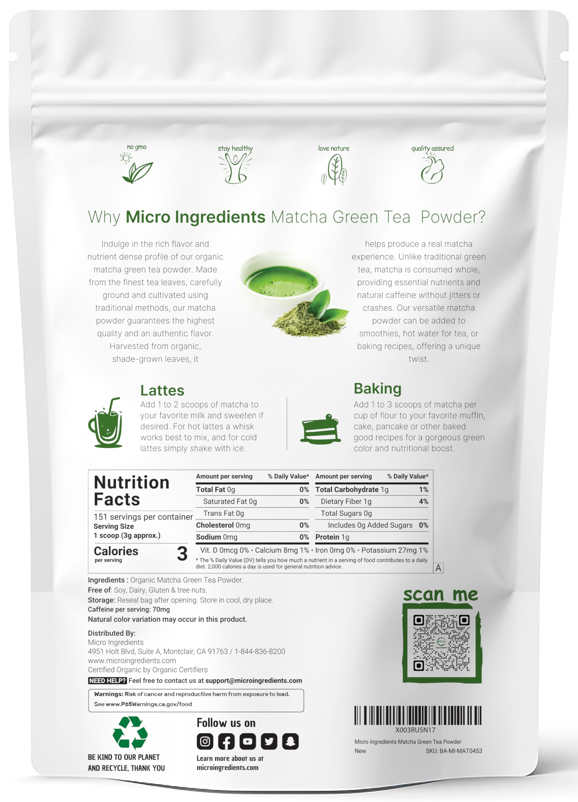 Micro Ingredients Organic Matcha Tea Powder, Pure Matcha Powder Green Tea, 1 Pound, Culinary Grade and First Harvest Authentic Japanese Origin, Unflavored.