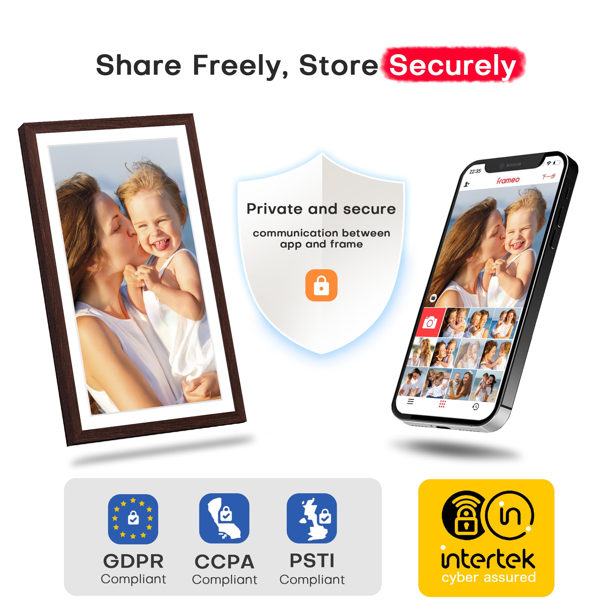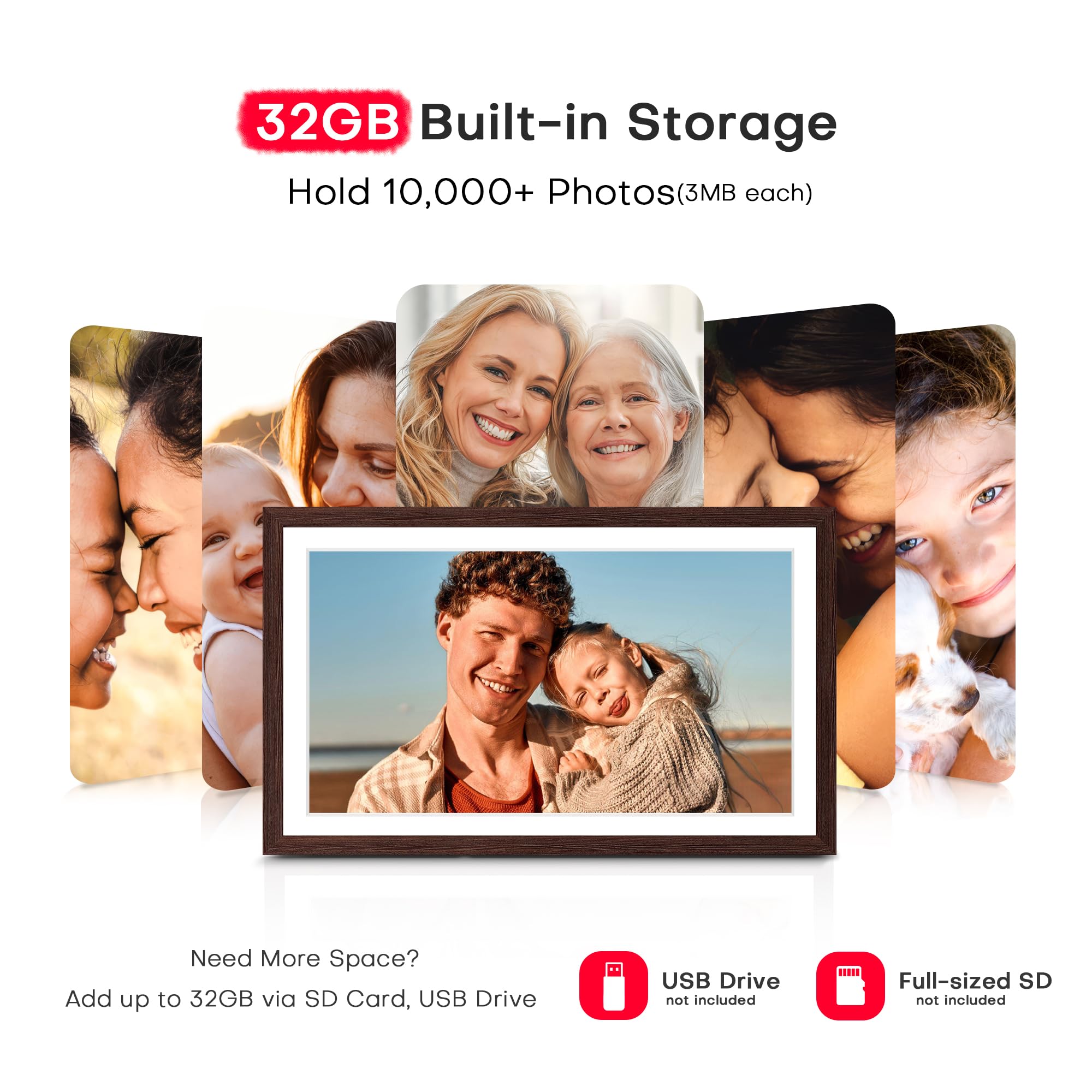 Frameo APP; With World's top Digital Frame App - Frameo, you can instantly share photos and videos to your WiFi-connected (Only supports 2.4GHz Wi-Fi) digital picture frame from anywhere – it's secure, private, and supports unlimited members. Existing Frameo users can use the same app without additional downloads. Flyruit 15.6 inch large digital frame has 32GB built-in storage and support up to 32GB external storage (full-sized SD Card, USB Drive, not included), capable of holding 10,000+ photos(3MB each)