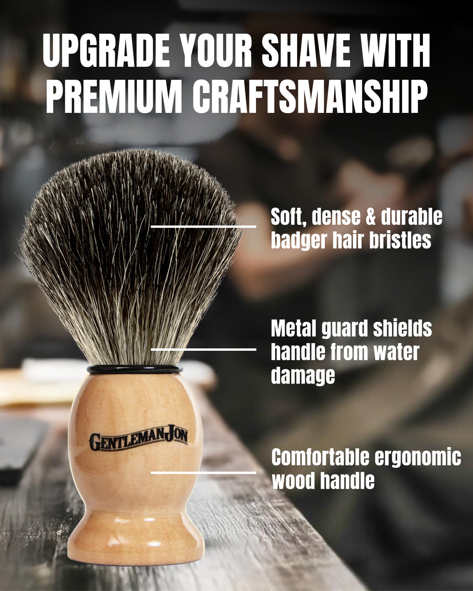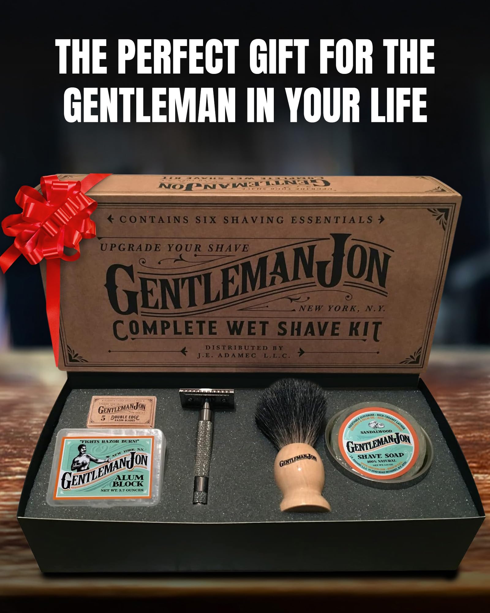 COMPLETE MEN'S SHAVING KIT: The Gentleman Jon Shaving Kit for Men is a comprehensive set that includes a safety razor, badger hair brush, alum block, shave soap, stainless steel bowl, and five razor blades - everything needed for a luxurious, comfortable and smooth wet shave experience. With its compact design, our product is also a suitable travel companion to those who value traditional shaving, ensuring a neat shave even while on the go.