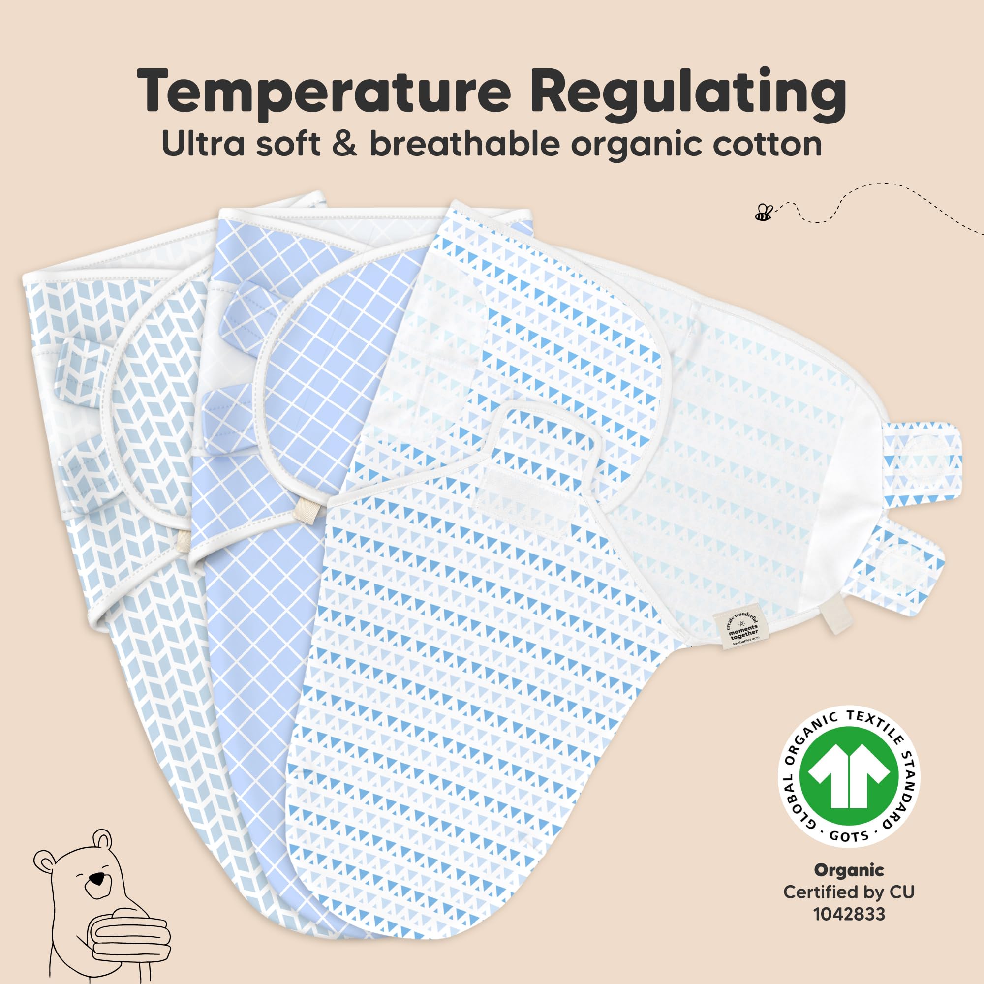 Breathable & Temperature-regulating - Our Soothe Swaddle for newborns is made with ultra-soft Organic Cotton (GOTS Certified by CU 1042833), it is lightweight and highly breathable which makes it a highly-raved newborn swaddle sack for all seasons.