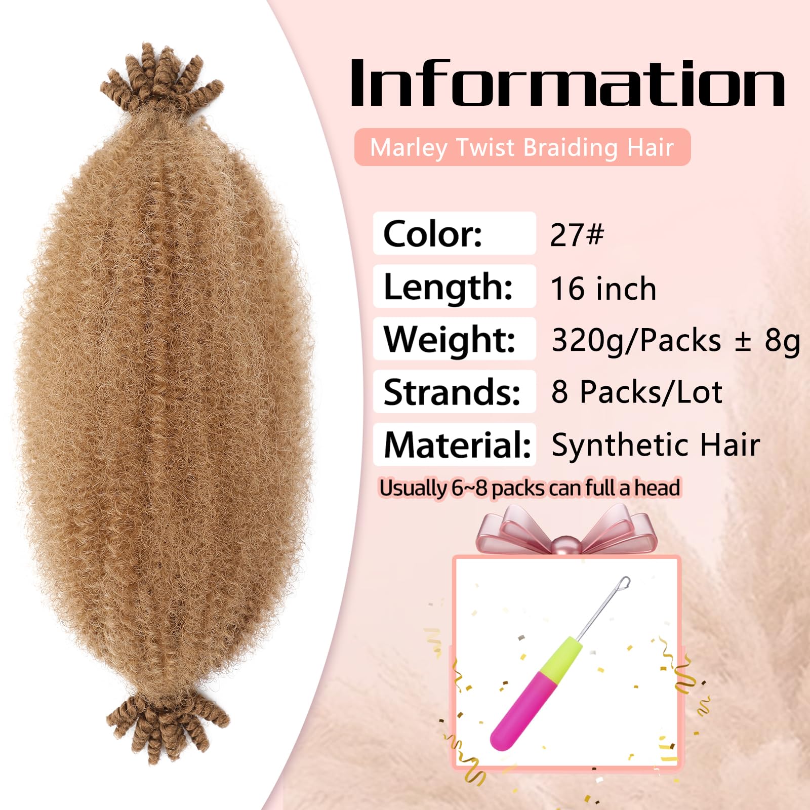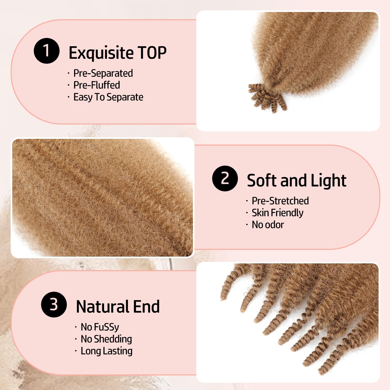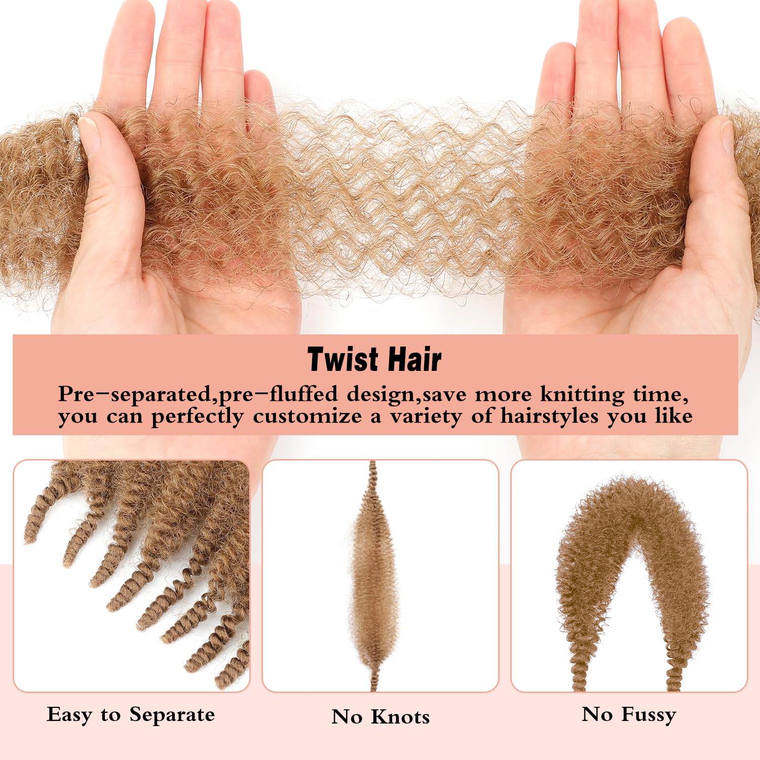 1. Advantages: Afro Twist Hair Made Of High-Quality Synthetic Fiber, The Hair Extensions Look Natural, Soft, Strong, Imitating Real Hair, Preventing Frizz, Tangling And Shedding, Bringing A Long-Lasting And Smooth Effect