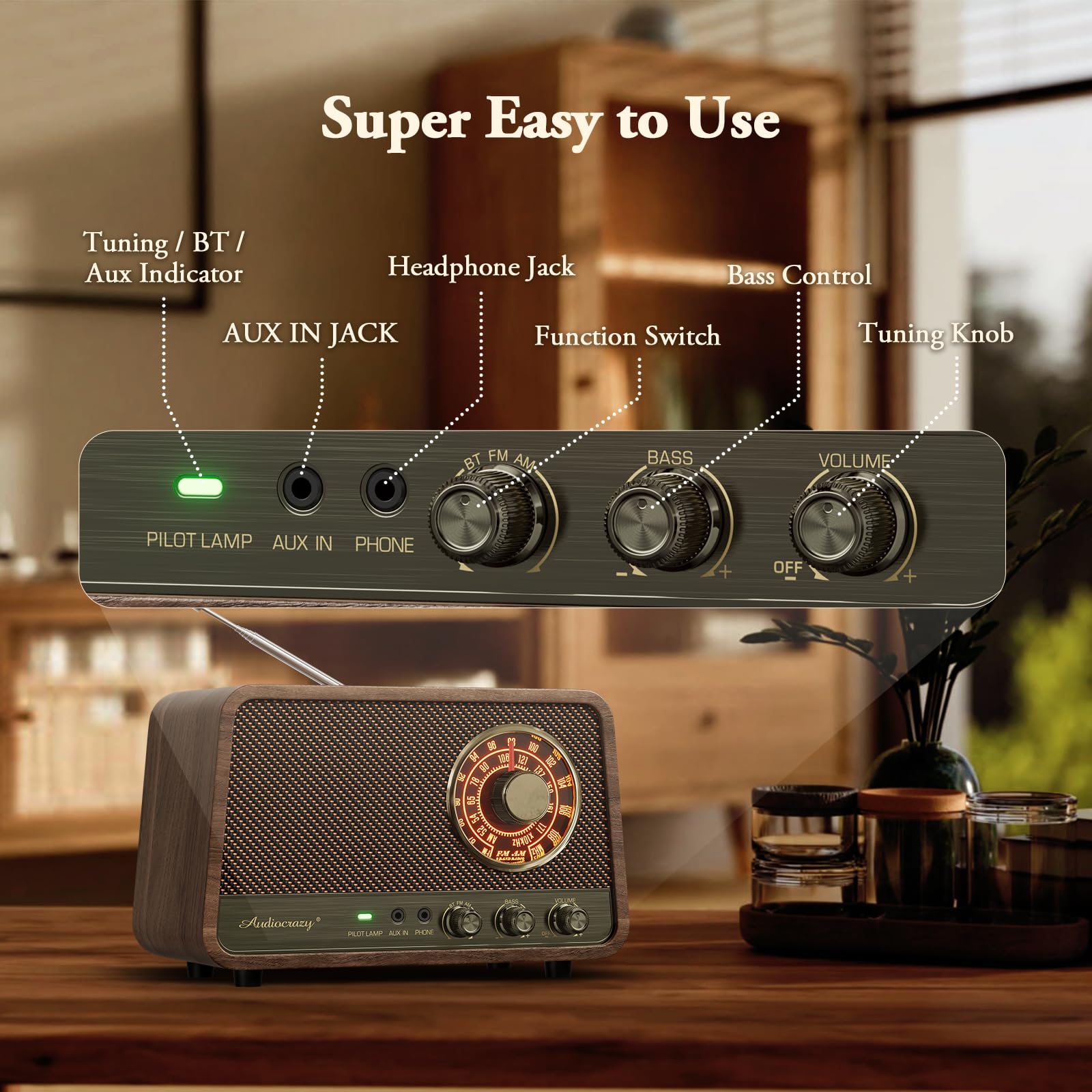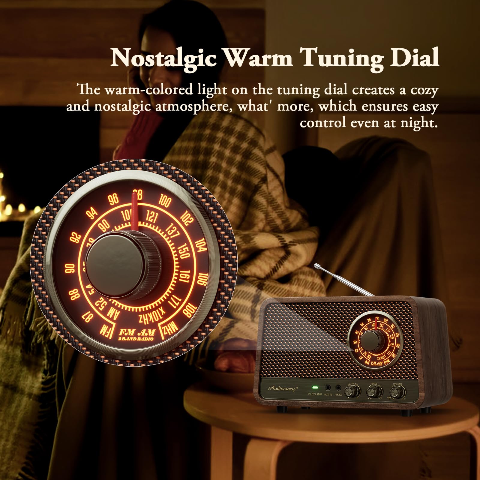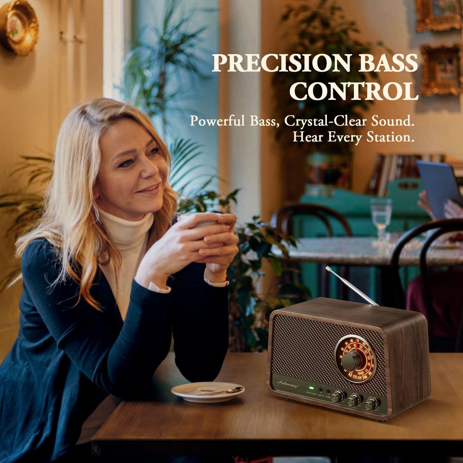 【CLASSIC DESIGN MEETS MODERN PERFORMANCE】 Vintage Wooden Finish AM FM Radio, Precise Rotary Vernier Tuning with a Softly Glowing Dial, Bass Control and Volume Control, which blends modern technology and retro classic aesthetics, matches seamlessly with the texture of your leather or wooden furniture around your house.