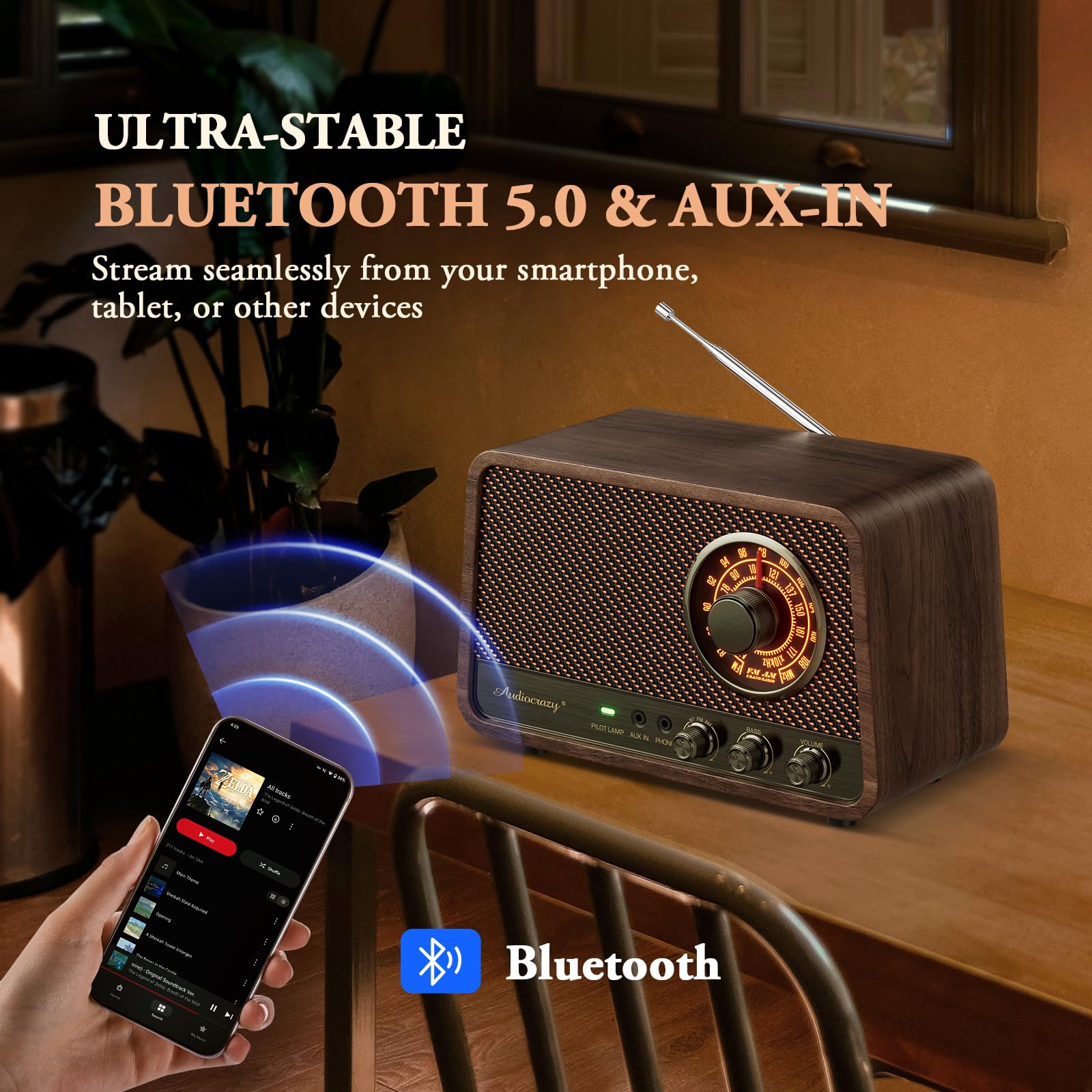 【RETRO BLUETOOTH 5.0 SPEAKER WITH AUX INPUT】More than just a retro radio, it's a versatile retro Bluetooth speaker featuring Bluetooth 5.0 and Aux input. A dependable 5.0 Bluetooth technology allows you to stream your music from your phone to the radio speaker. .Auxiliary Input for Additional Audio Sources Like MP3 Player or iPod/iPhone.