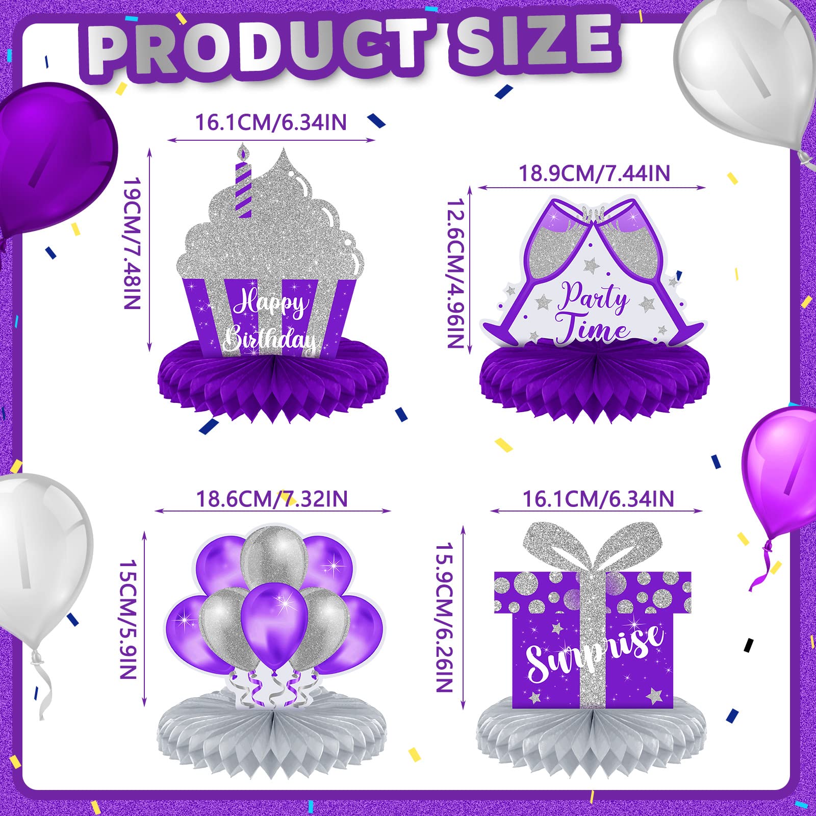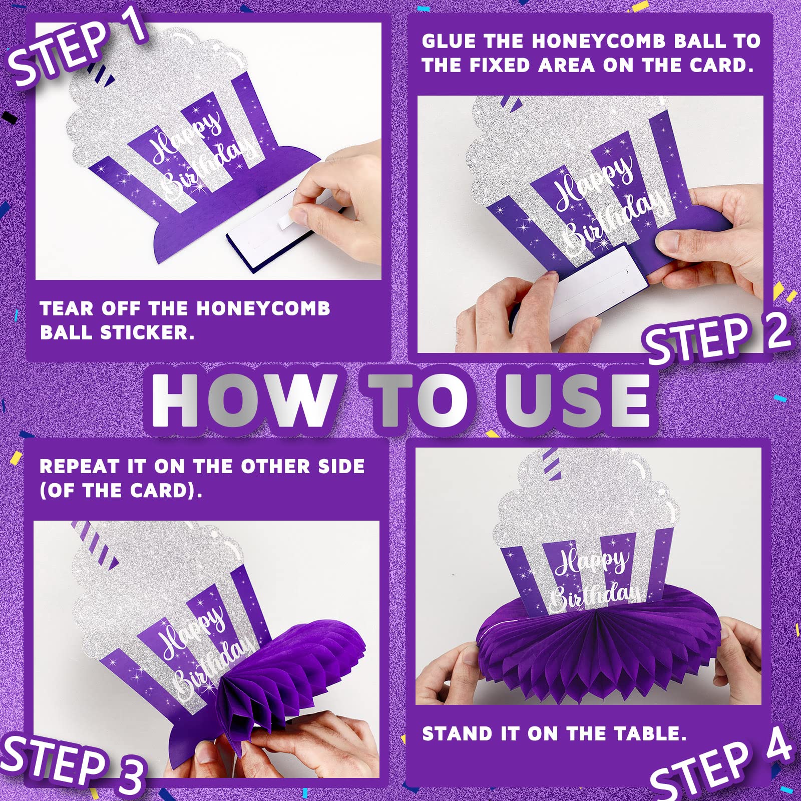 Easy to Use: these honeycomb decorations are convenient for you to operate, just peel away the paper film, attach the honeycomb ball to the bottom of the card and secure them, gently unfold the honeycomb ball with your hand to get a complete silver and purple centerpiece for your birthday party