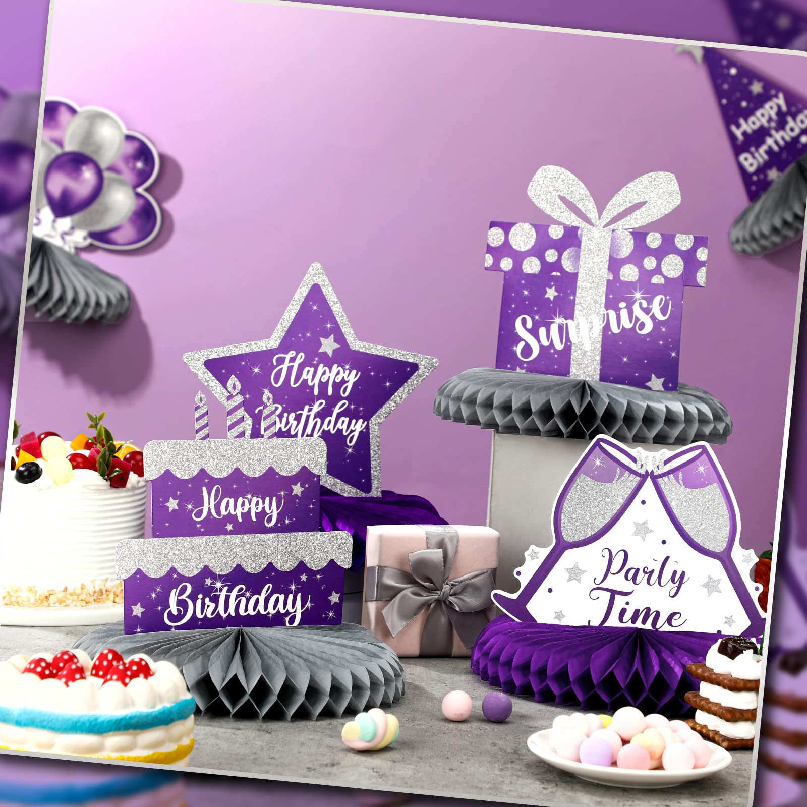 Celebrate Your Birthday: these table decorations for party come in 8 different styles, including balloons, stars, gift boxes, beer mugs and cakes in purple and silver, simple and stylish design, enhancing the atmosphere of the birthday party