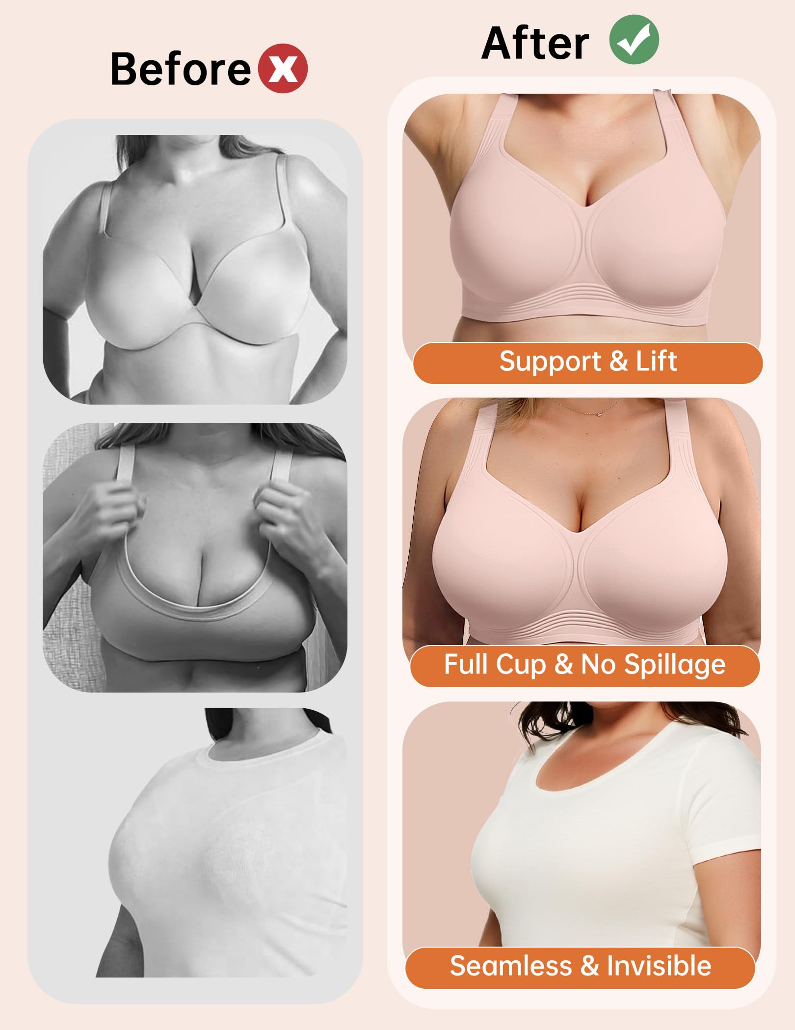 Ultimate Support & Lift Gel Wireless Pushup Bras for Women: Experience unparalleled support without the underwire! Our innovative jelly-bonded structure and 360° supportive bands are engineered to provide lift and shape that rival traditional underwire bras. This wireless pushup bra features a V-neck and wide reinforced underband with dual side boning that work together to prevent bounce, smooth your silhouette, and offer secure, all-day support—a feature that fuller figures deserve