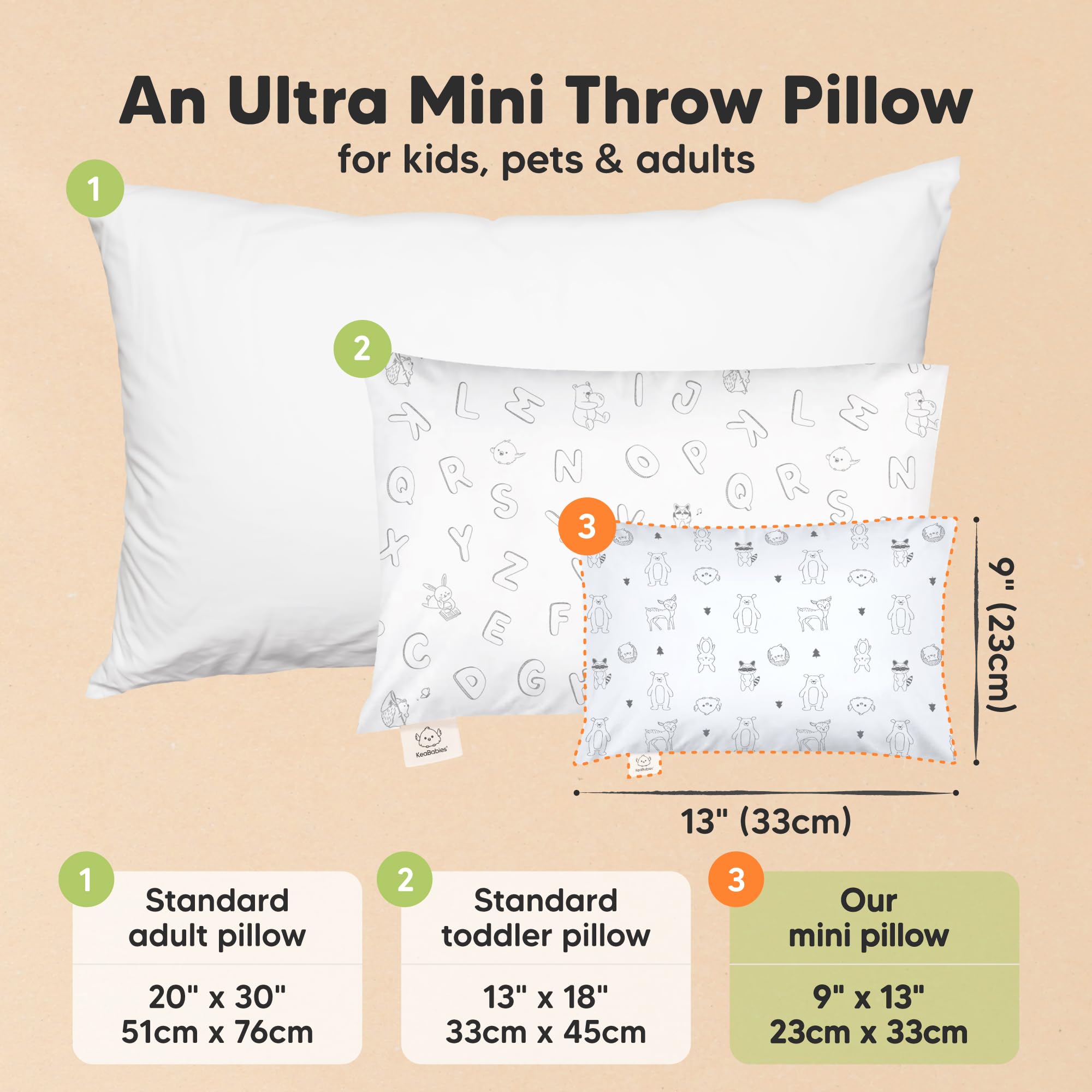Introducing the 9"x13" Mini Toddler Pillow - A spin-off from the wildly popular KeaBabies My Little Dreamy Toddler Pillow. This small pillow is ergonomically crafted for sleep, play, and travel, and is sure to become your child's new favorite pillow.