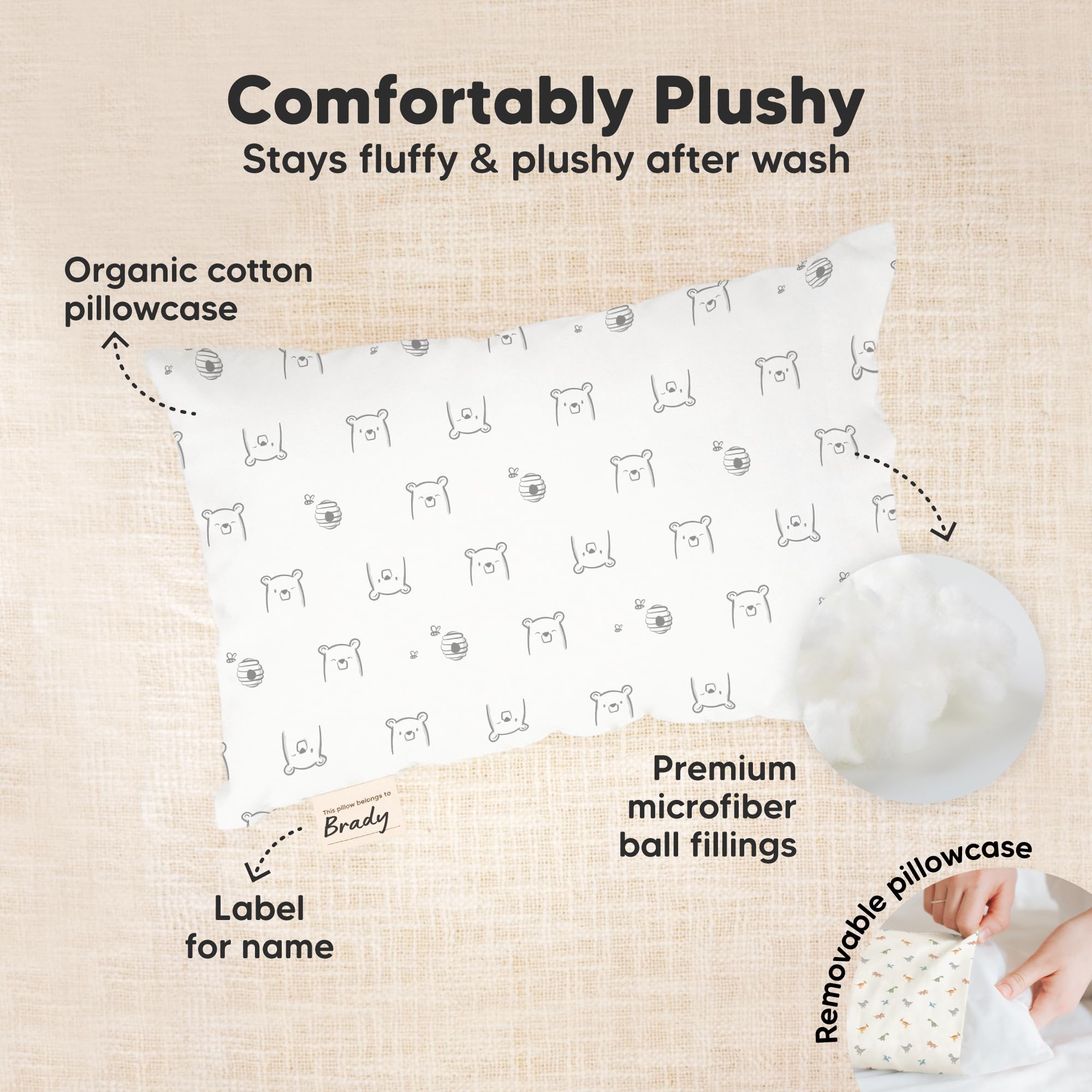 Durable & Washable - Both the toddler pillow and toddler pillowcase of our Mini Toddler Pillows for Sleeping are machine washable, keeping your toddler’s mini pillow clean and fresh all the time.