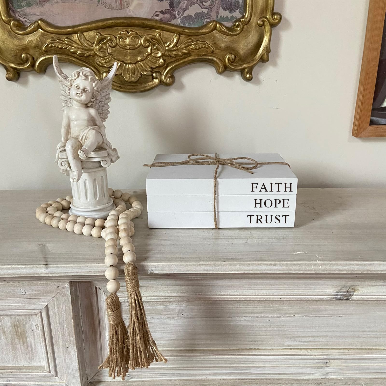 What You'll Receive: a set of decorative white books that say "Faith, Hope, Trust". The set also includes a farmhouse bead garland with tassels, creating a stylish look for your bookshelf, nightstand, coffee table and fireplace.
