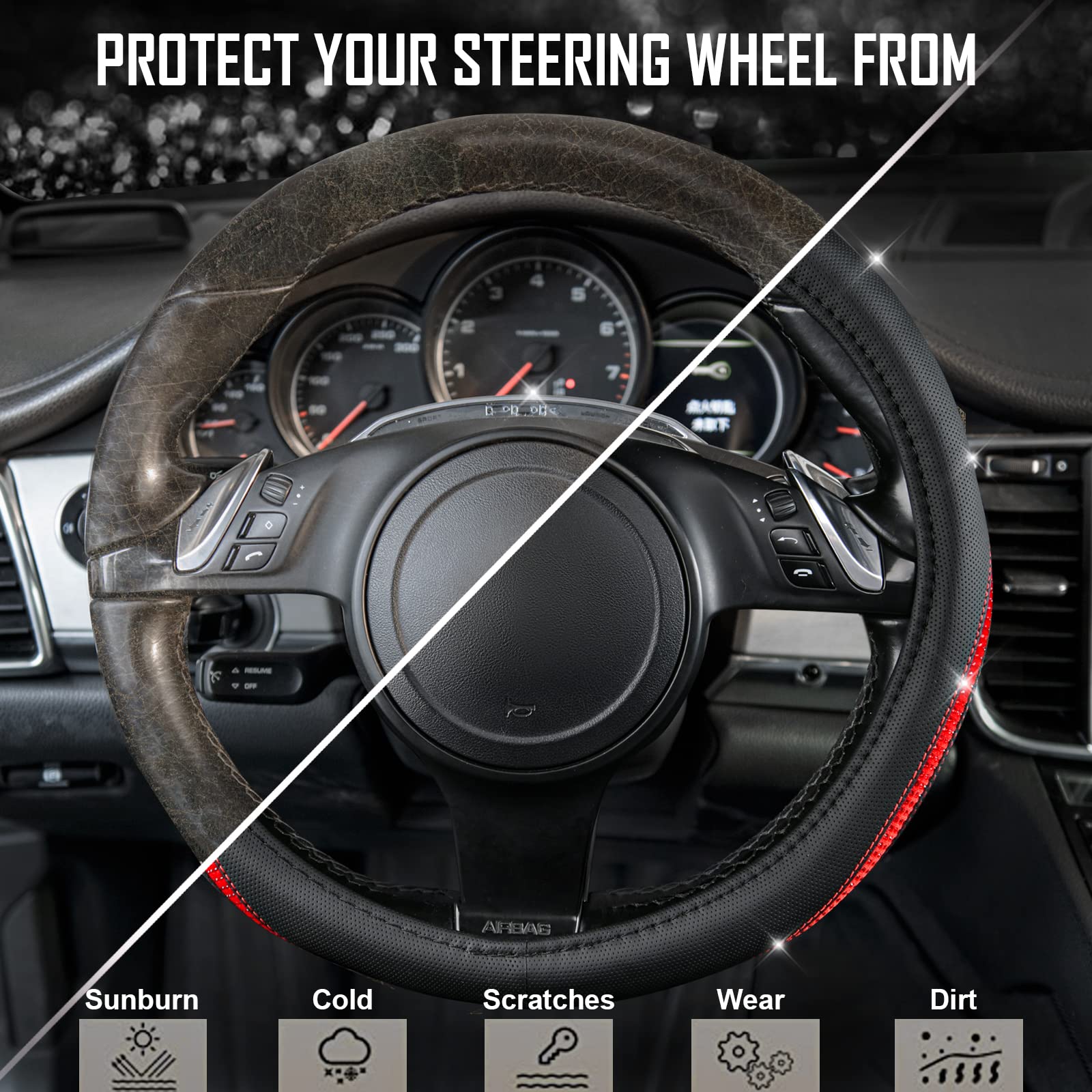 BLING DIAMOND LEATHER: Premium Quality Material: PU Leather and Top diamond craftwork. The Crystal Steering Wheel Cover made of durable microfiber leather and DIAMOND, consisted hundreds of shiny rhinestones. Super Sparkly, Better Spotlight. Non-Dropping Diamond, Comfortable Feelings, does not scratch hands, and has good anti-slip effect.
