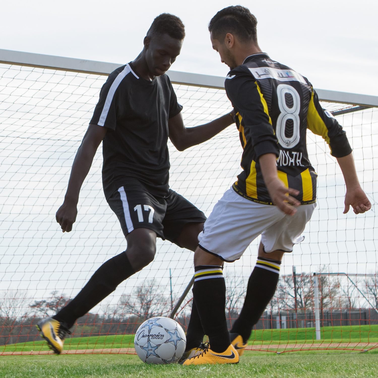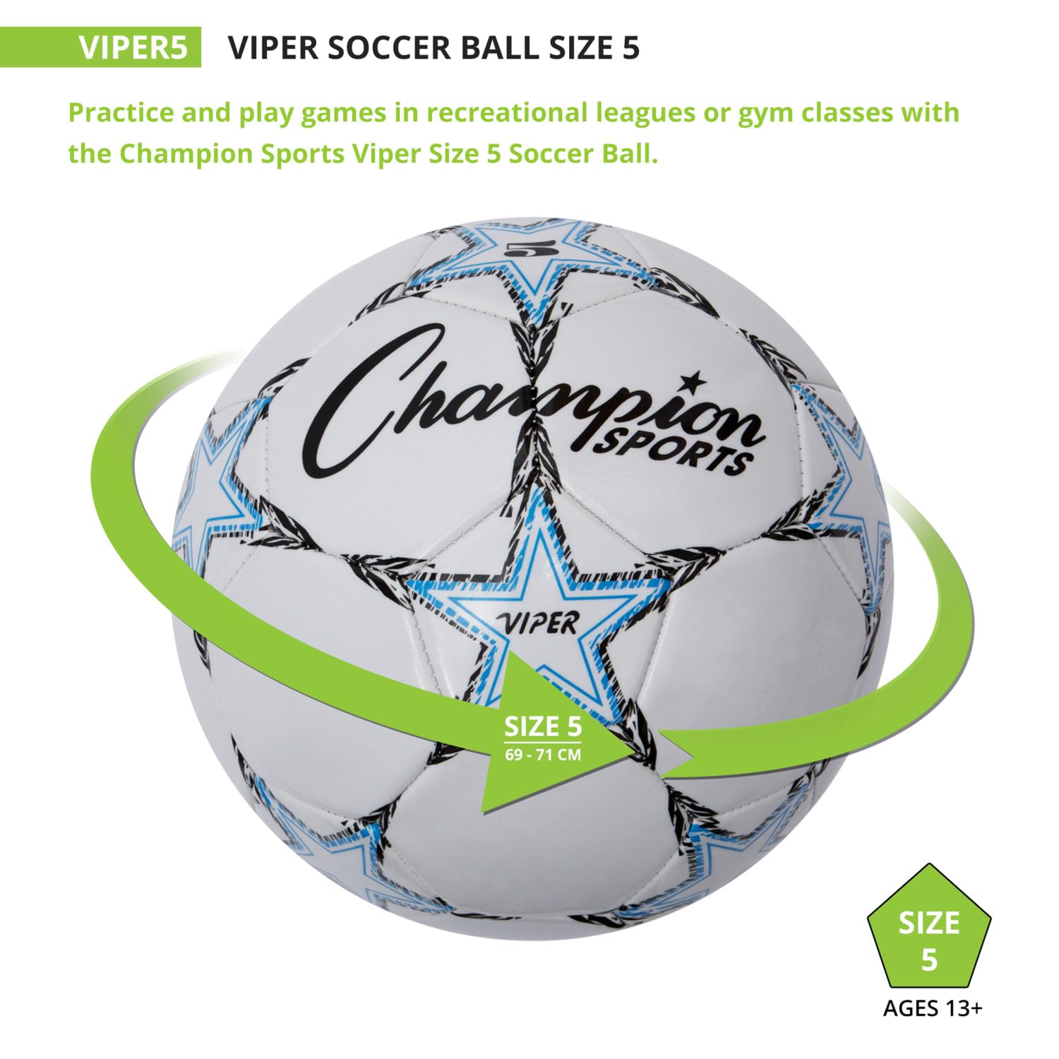 A great choice for young players or recreational use, the Champion Sports Viper Soccer Ball prioritizes comfort and durability. The soft-touch TPU cover makes heading, kicking, and blocking the ball easier on young athletes, while the airlock butyl bladder and machine-stitched panels ensure the ball retains its shape and air pressure throughout regular play. This versatile soccer ball can be used indoors or outdoors, and comes in a variety of sizes to suit your needs: VIPER3 (Yellow/Black/White) for ages 8 & under, VIPER4 (Red/Black/White) for ages 8 to 12, and Official size VIPER5 (Blue/Black/White) for ages 12 & up.