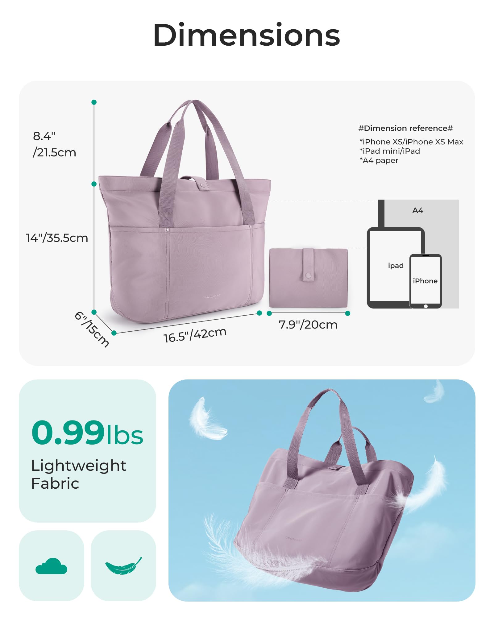 Large Size and Foldable-Unfolded: 16.5''L x 6''Wx 14''H, Folded: 7.9'' x 7''; This large tote bag has a huge capacity and can hold A4 books and 15.6-inch laptops. The travel tote bag can be folded into a small pouch, easy to put into your backpack, travel bag, duffle bag or suitcase, save your space.