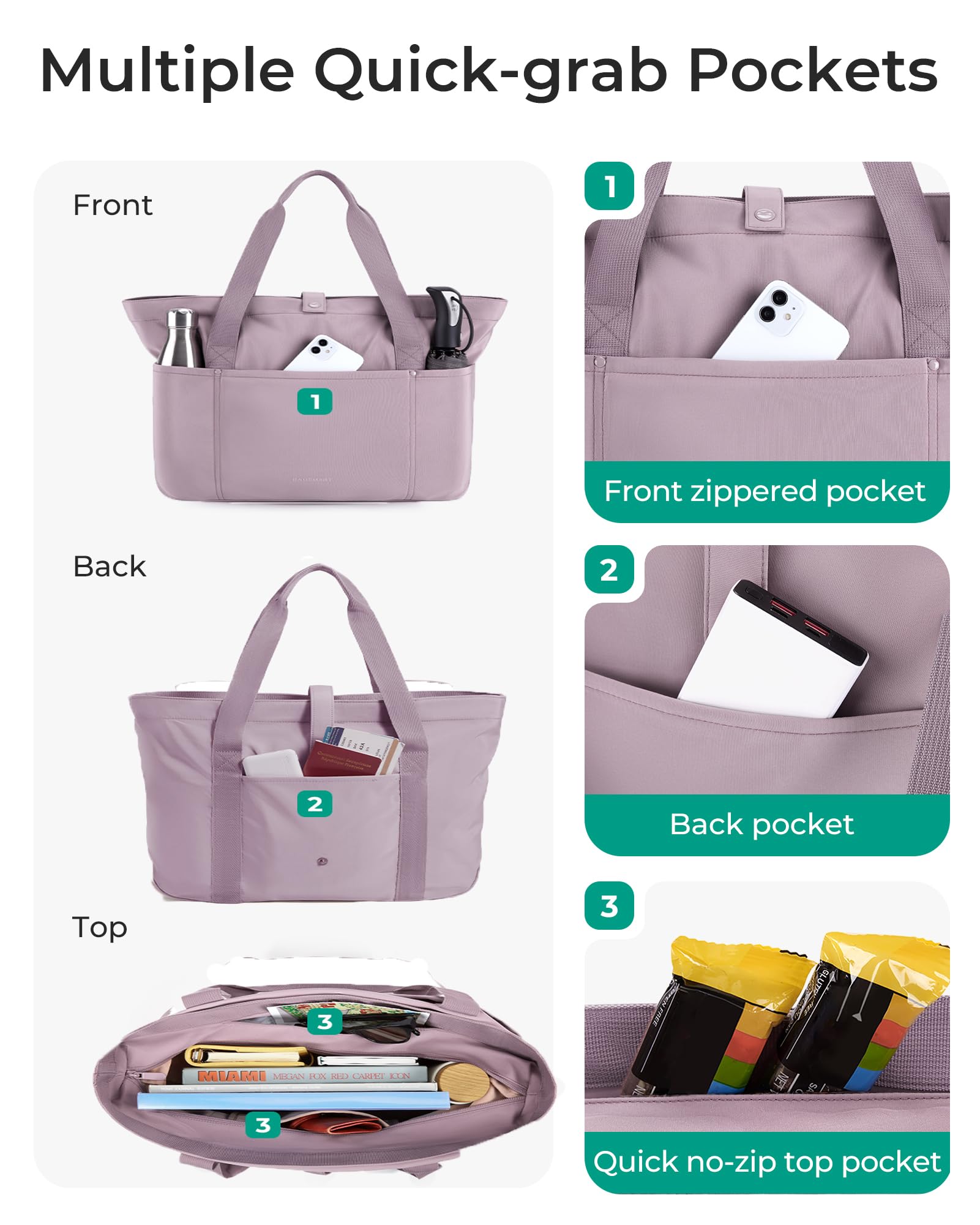 Roomy Space-Capacity 20L,The women tote bag feasures 6 separate pockets; Main zipper compartment can easily hold A4 folder, clothes, etc. 2 Outer handy pockts+ 1 front zippered pocket+1 slip pocket+ 1 back pocket allow you quick access the items you need.