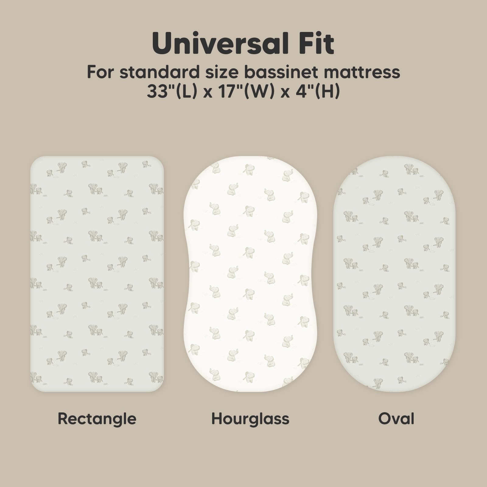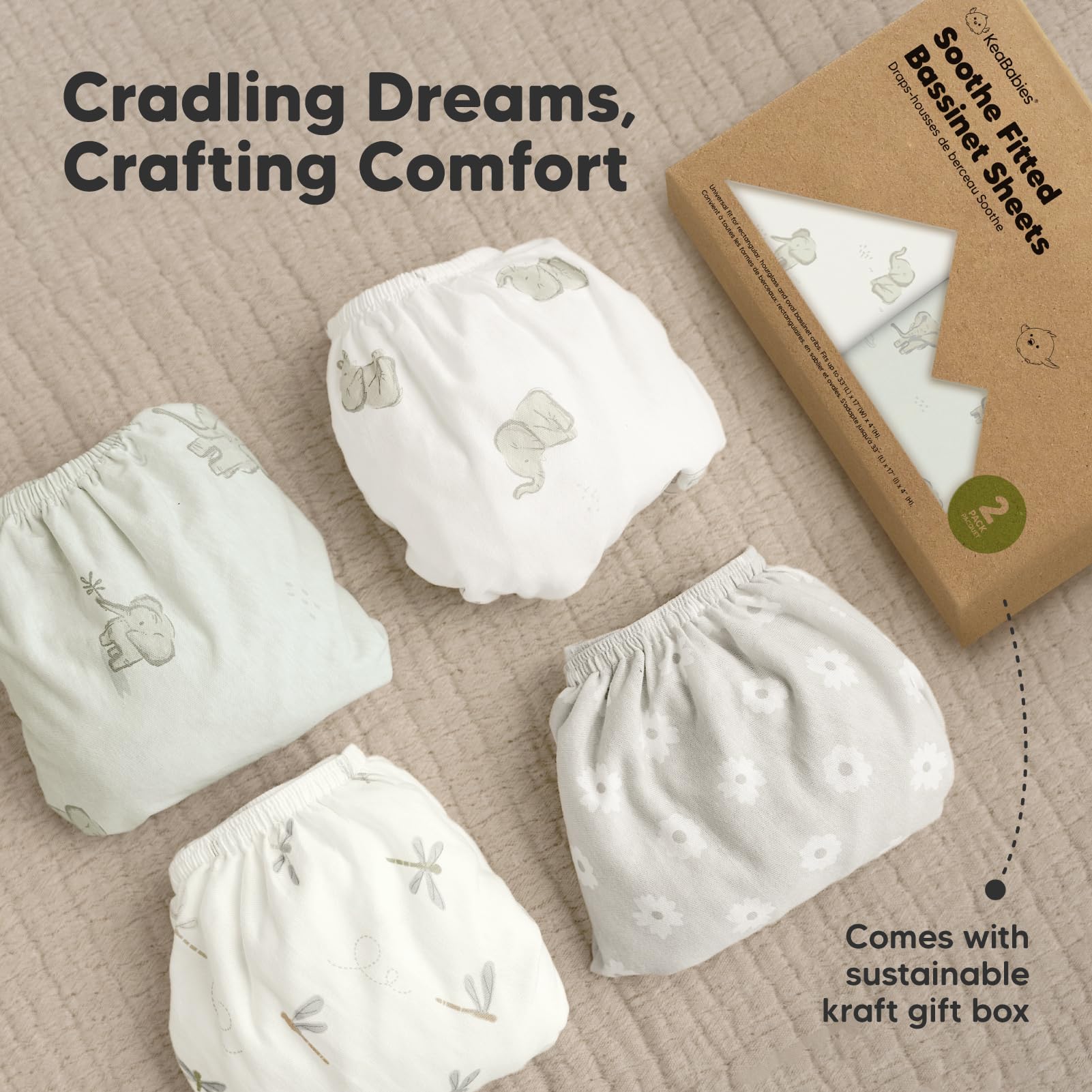 2-Pack Bassinet Fitted Sheets - KeaBabies Soothe Bassinet Mattress Sheets, sized at 33" x 17" with a depth of up to 4", provide a universal fit for all bassinet mattress pad types. They can be used as hourglass, oval, rectangle bassinet sheets.