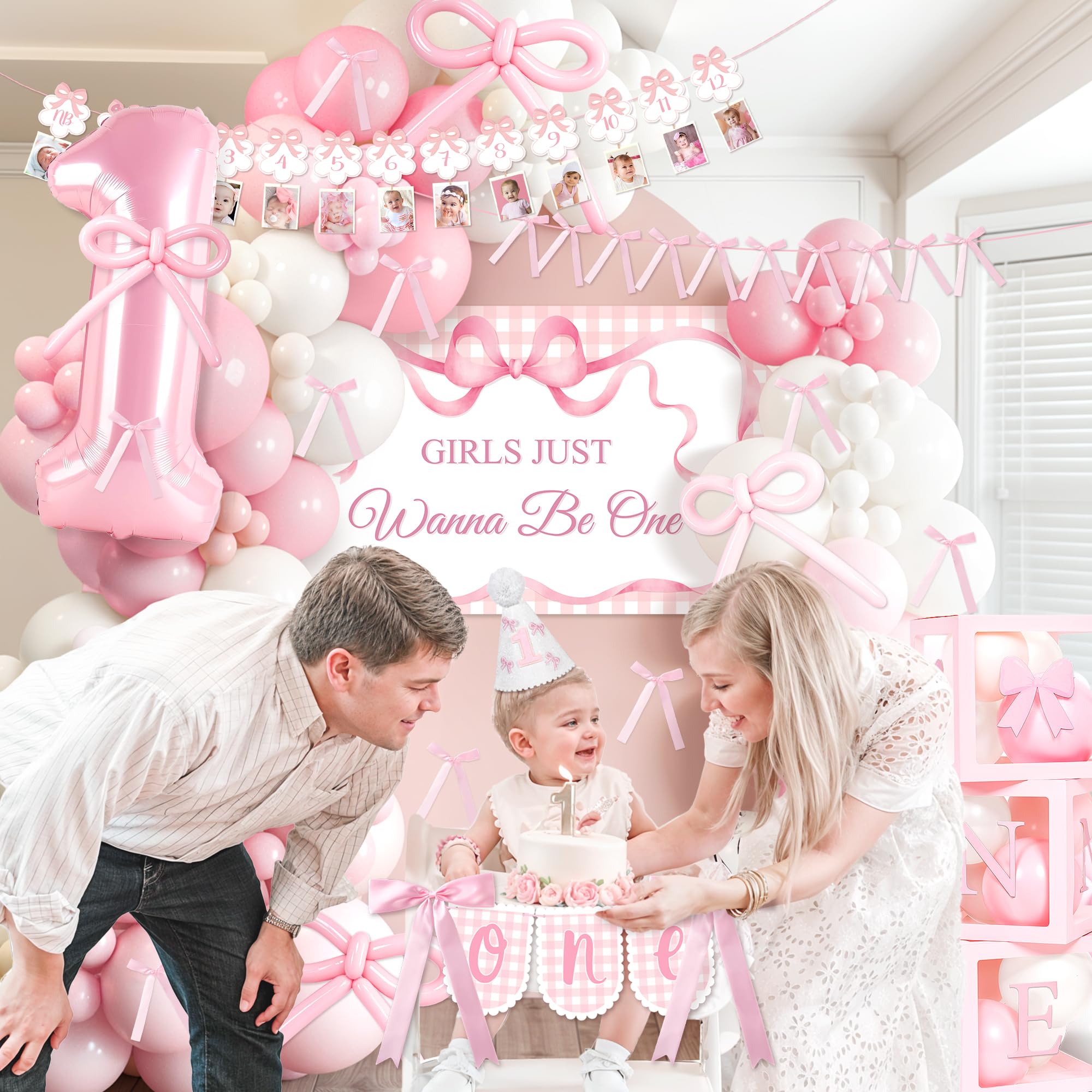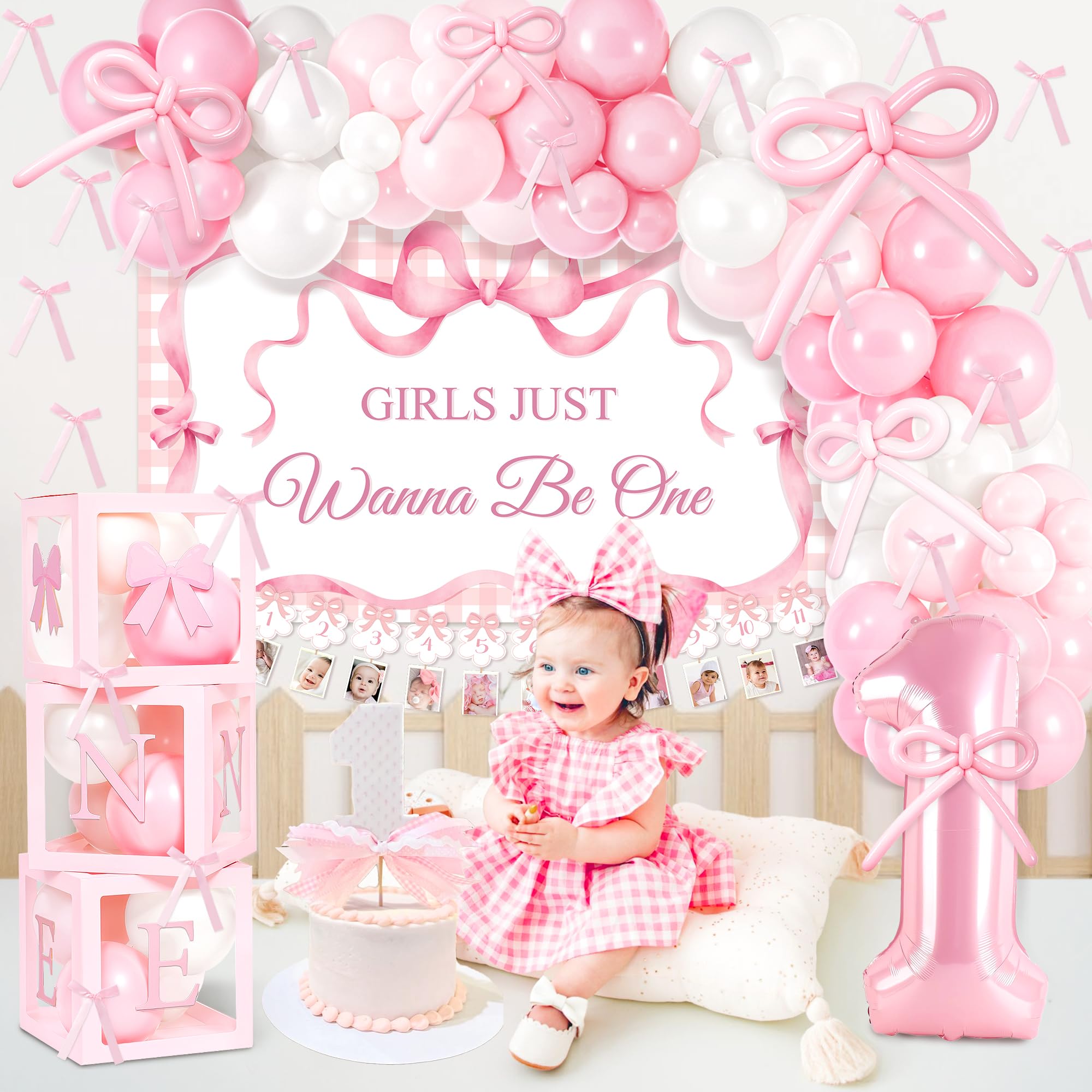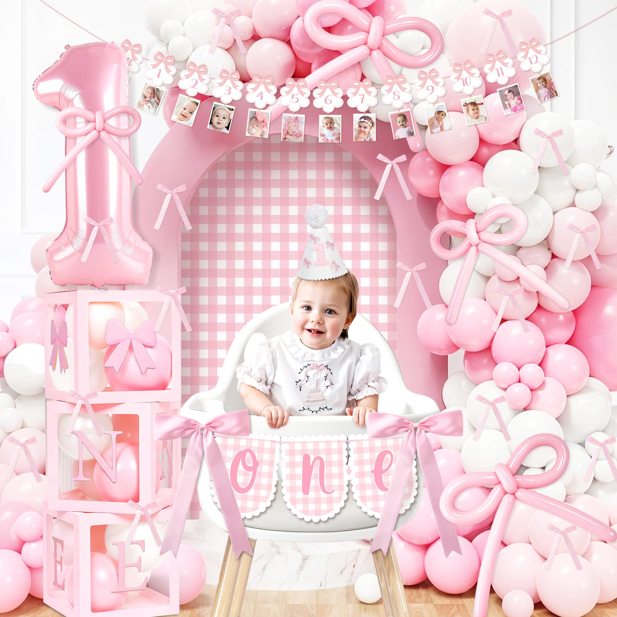 Complete 1st Birthday Decorations Girl Set: This all-in-one kit includes everything you need for a stunning first birthday celebration. All in One birthday decor kit including 100* latex balloons, 1* number "1" foil balloon, 10* strip balloons, 1* backdrop, 3* balloon boxes (with “one” letters), 1* newborn to 12 months photo banner, 1* high chair banner, 1* birthday crown, 1* Bow 1st Birthday cake topper, 1* birthday Milestone Poster, organize unforgettable 1st bow birthday party for your girl, this set covers all your decorative needs.
