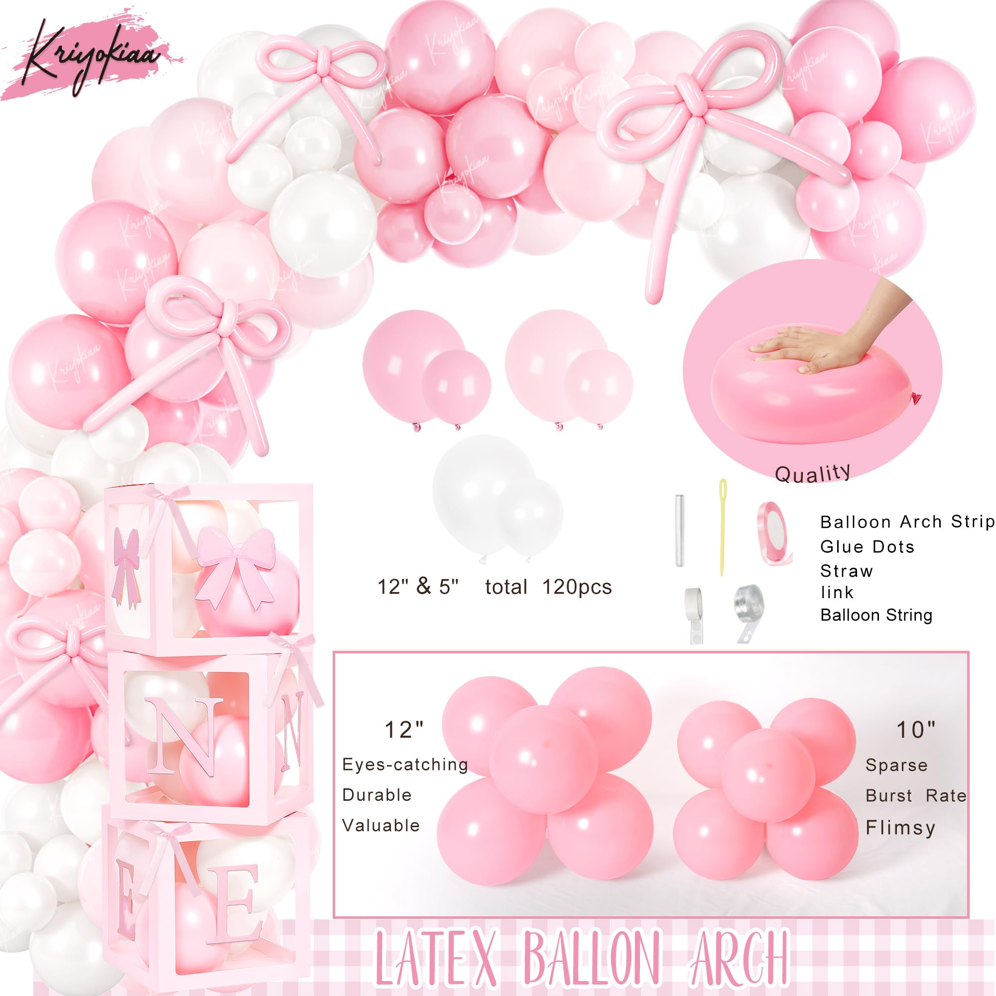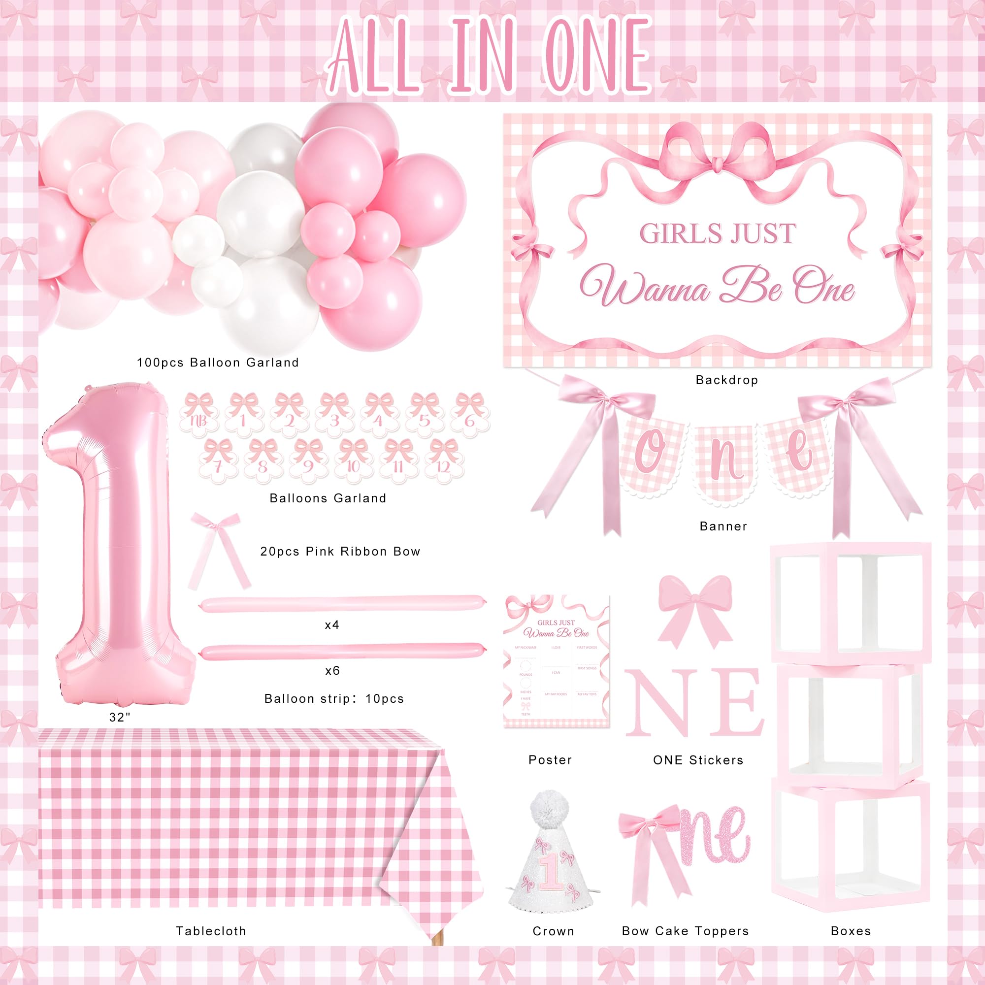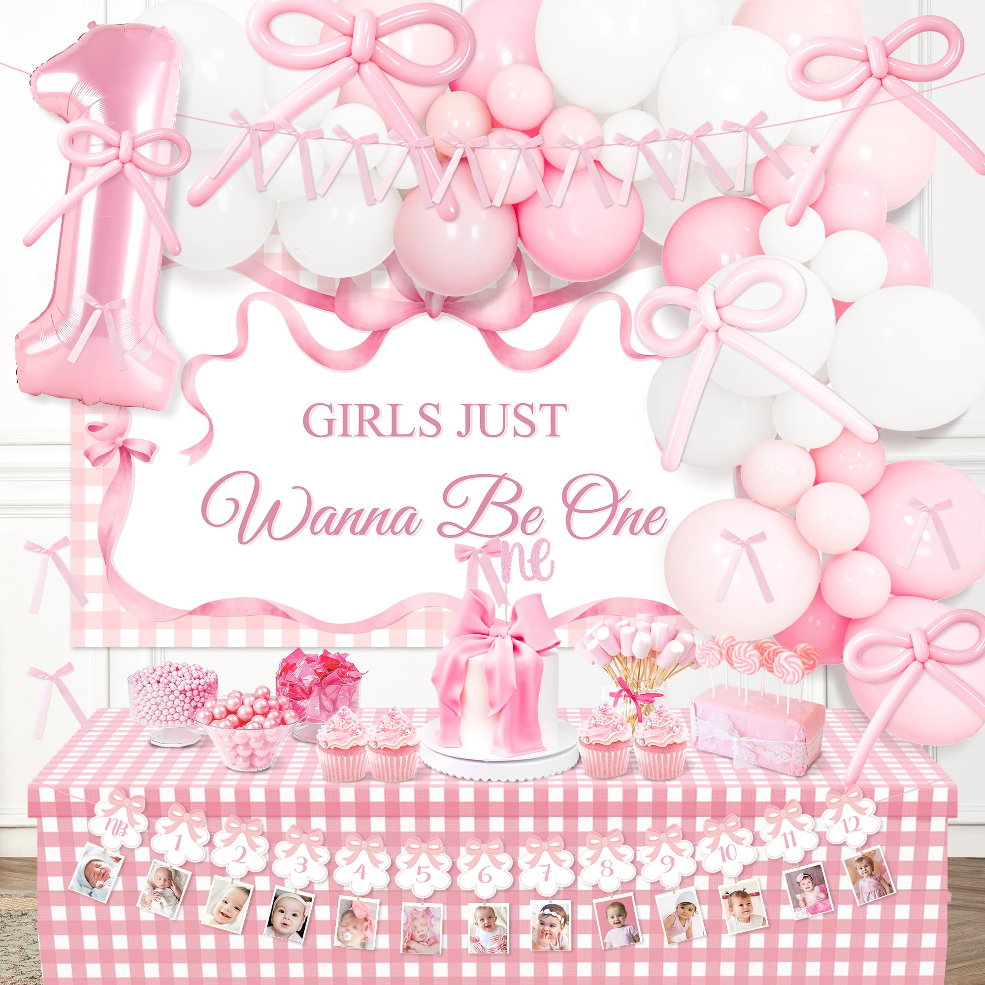 Complete 1st Birthday Decorations Girl Set: This all-in-one kit includes everything you need for a stunning first birthday celebration. All in One birthday decor kit including 100* latex balloons, 1* number "1" foil balloon, 10* strip balloons, 1* backdrop, 3* balloon boxes (with “one” letters), 1* newborn to 12 months photo banner, 1* high chair banner, 1* birthday crown, 1* Bow 1st Birthday cake topper, 1* birthday Milestone Poster, organize unforgettable 1st bow birthday party for your girl, this set covers all your decorative needs.