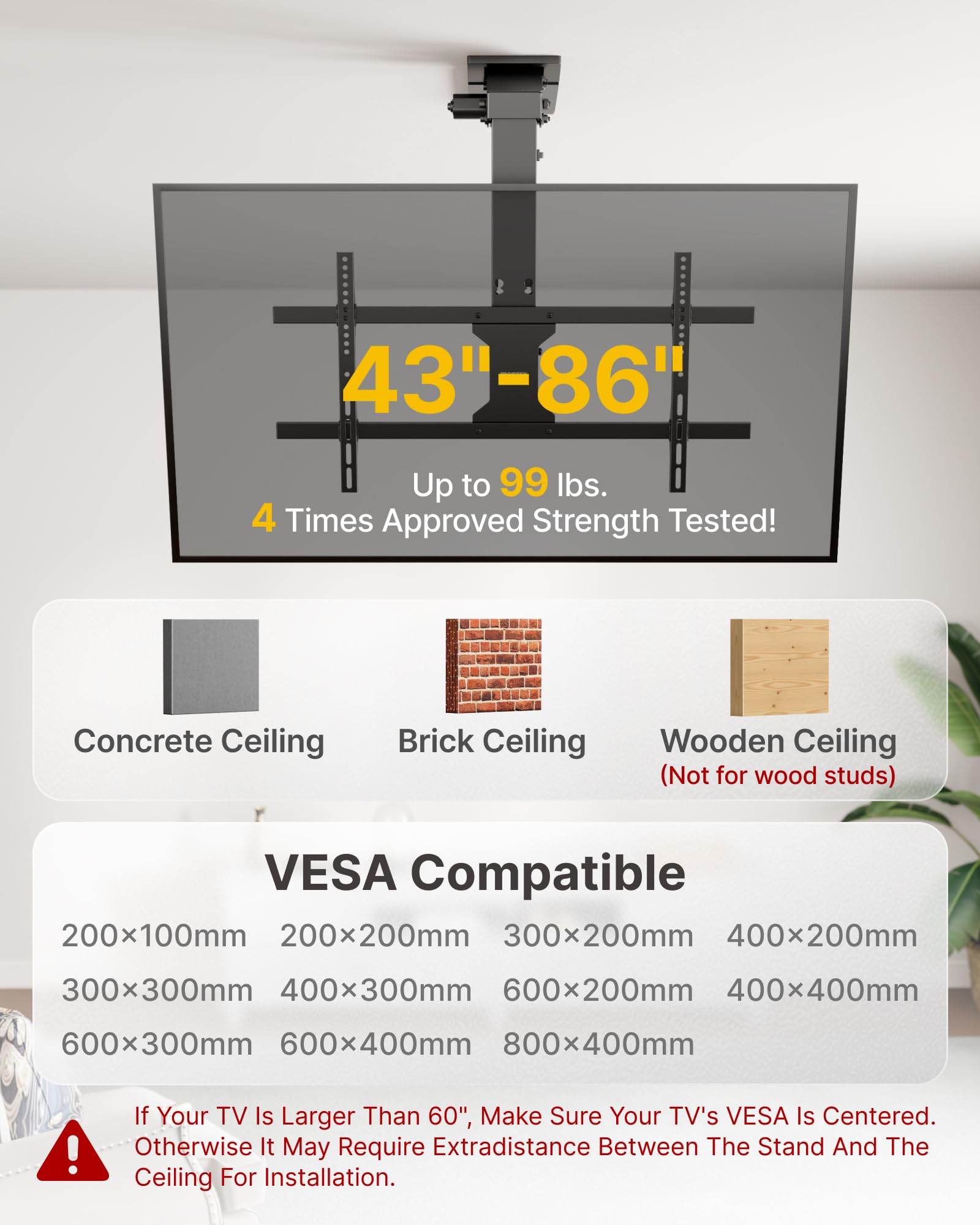 Note: Please sync the remote and receiver first! Follow the simple code pairing steps in the user manual. For a safe and easy setup, we recommend having two people for the installation. Before purchase, please verify your ceiling type and structure to ensure compatibility. For 55”, 65”, 70”or 75” TVs, ensure the VESA holes are centered for proper clearance between the screen and ceiling. If not, additional planks may be needed to adjust the distance.