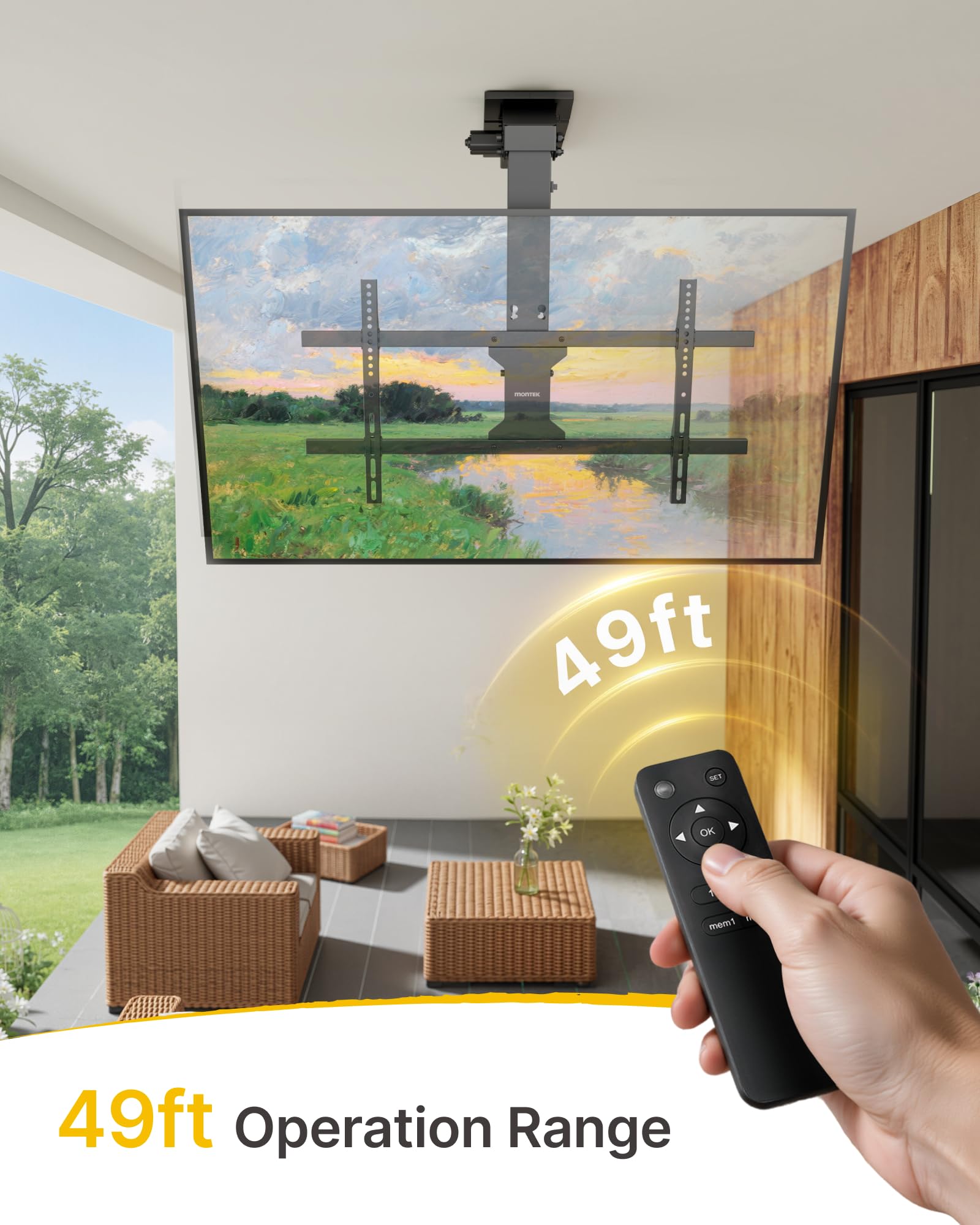 99LBS High Strength(4X Weight Tested!!!) & 20,000 Extension Cycles Tested!!! - Engineered for safety and strength, this sturdy motorized tv mount built with a powerful, upgraded motor for reliable performance and securely holds TVs weighing up to 99 lbs. monTEK motorized tv mount with remote installs seamlessly on flat or sloped concrete, brick, and wood ceilings. Note: Not for wood studs.