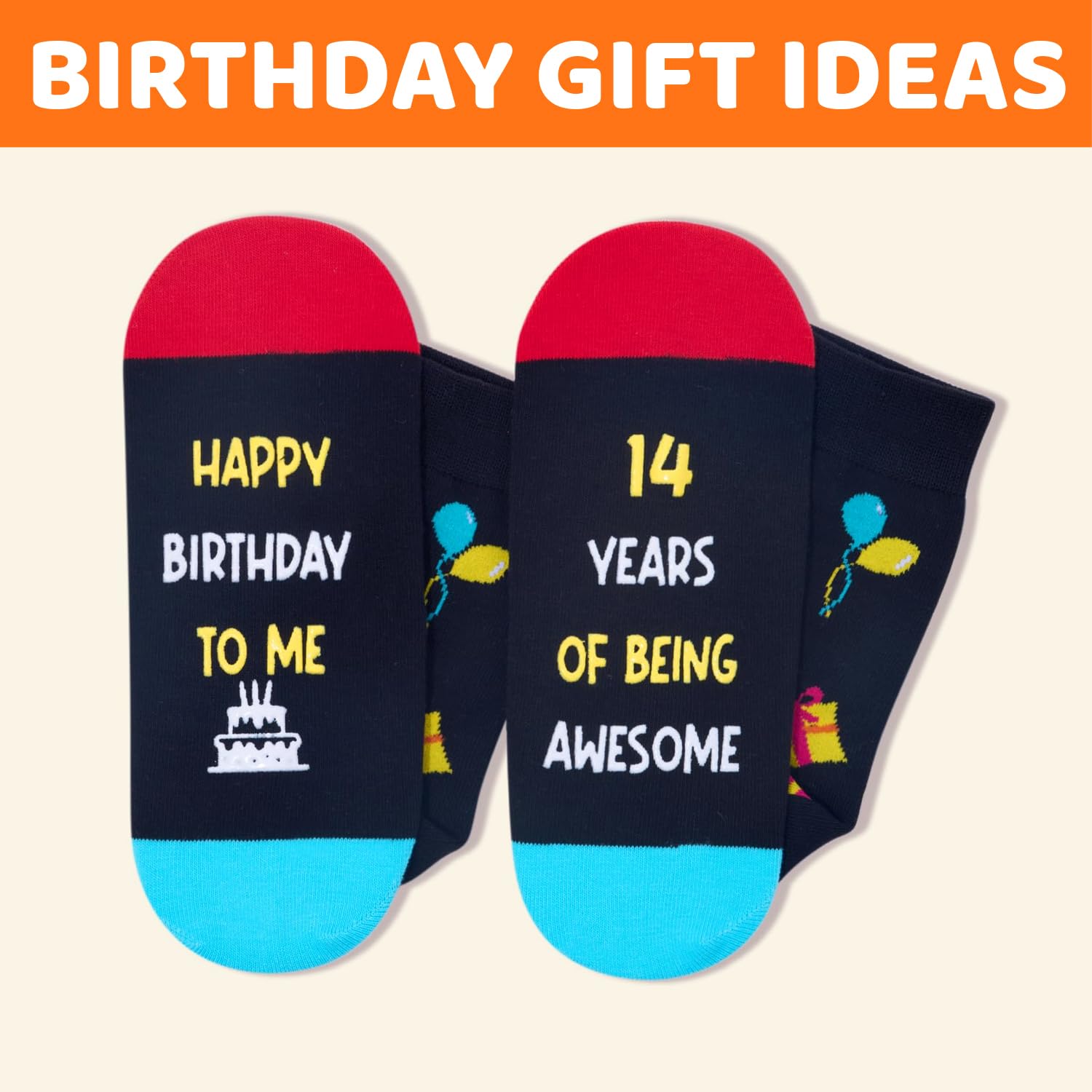 14TH BIRTHDAY GIFTS FOR BOY GRIL: These black "HAPPY BIRTHDAY TO ME, 14 YEARS OF BEING AWESOME" socks are perfect for teenage boys and girls.