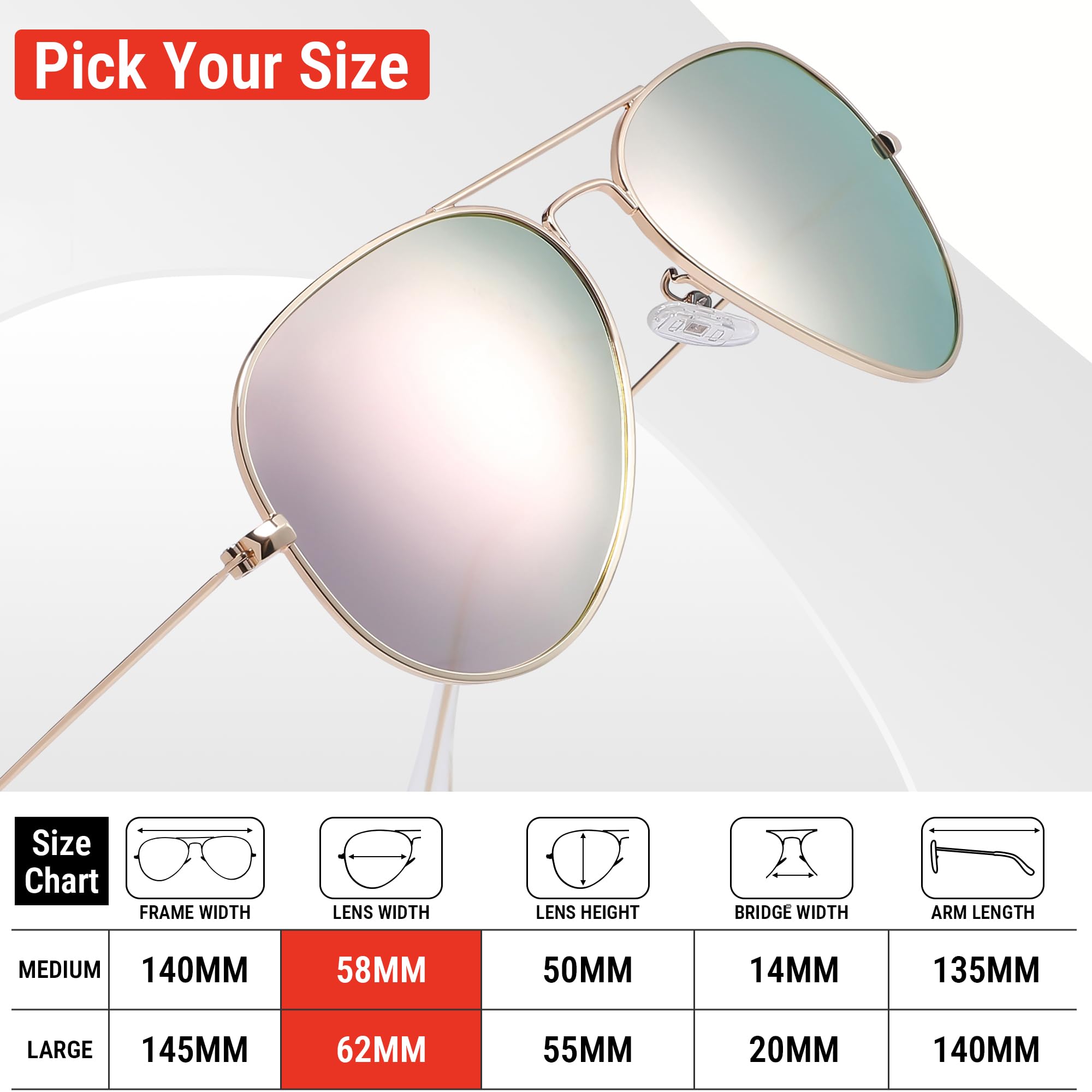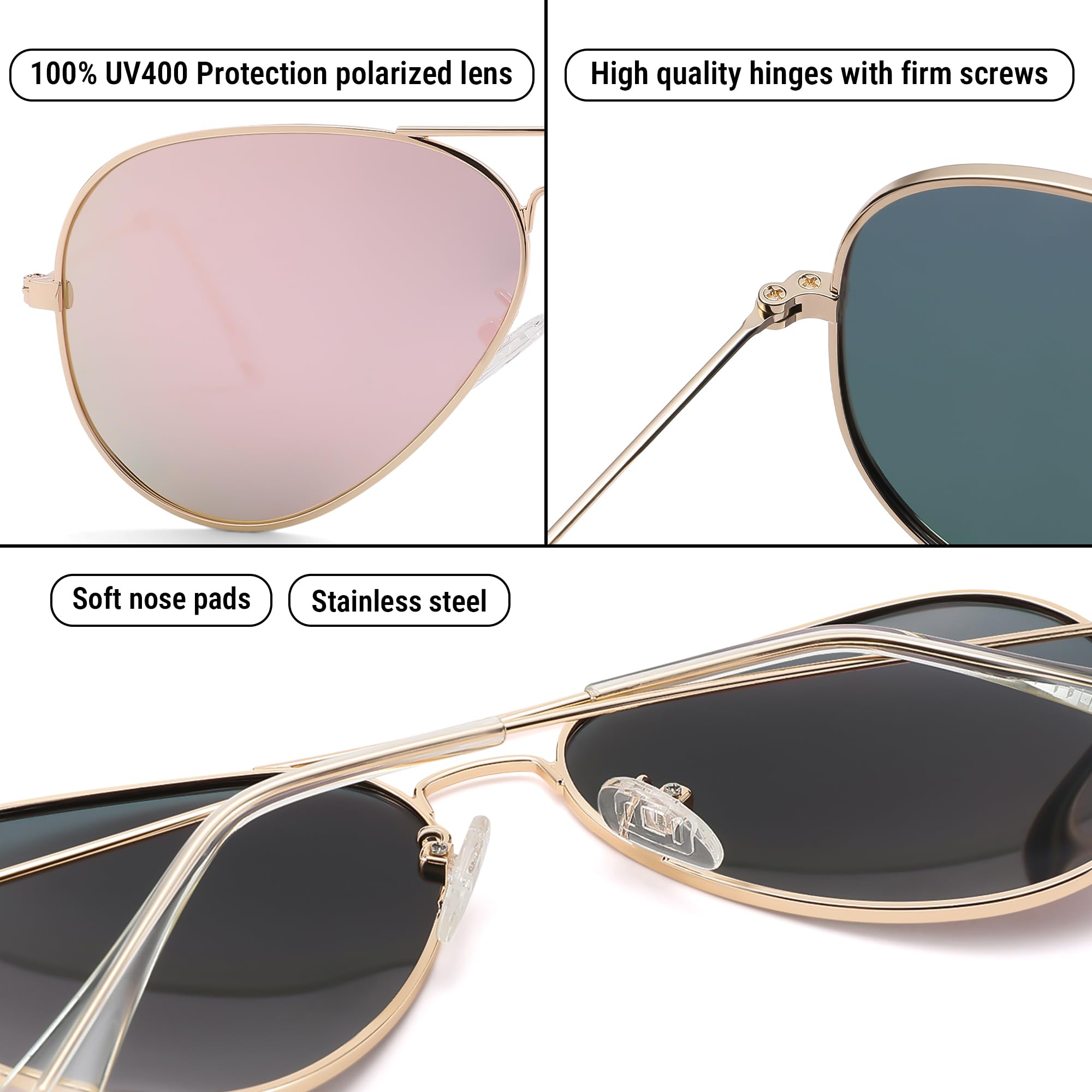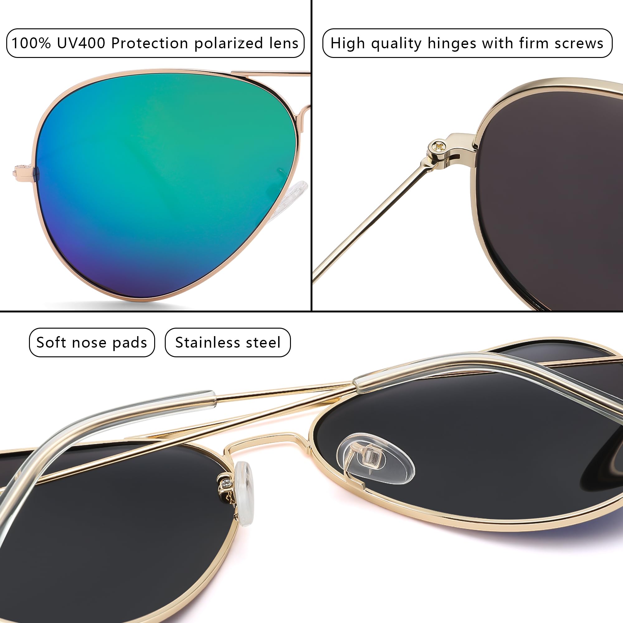 Polarized Protection: During outdoor activities, high-quality polarized glasses provide 99.9% UV400 protection and efficiently decrease glare. The classic aviator sunglasses are suitable for driving, cycling, fishing, and outdoor activities