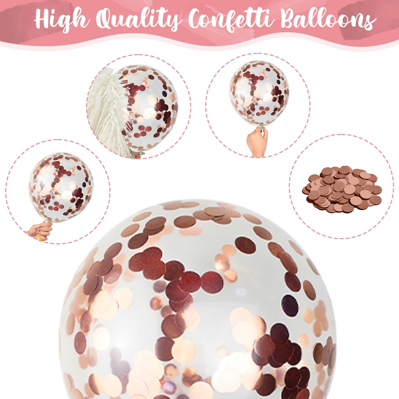 🎉 Easy to Use - The dusty pink rose gold balloons support both air and helium. You can blow them up with a mouth, pump or helium. After inflating, shake the confetti balloon and gently rub it with your hair or dry fabric to make the confetti stick to the side of the balloon, which can make the balloon look more beautiful. When the party is over, you can pop the balloons to let the confetti fall, adding fun to the party.