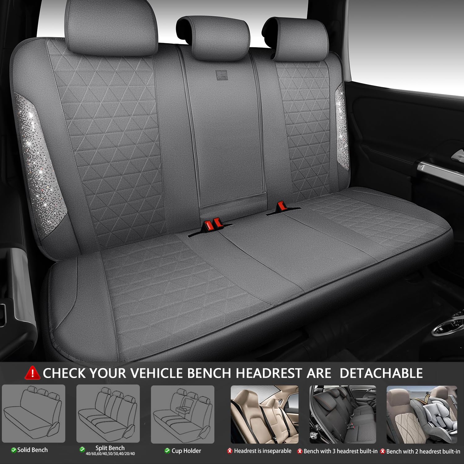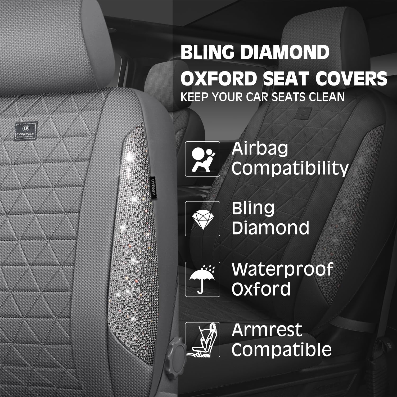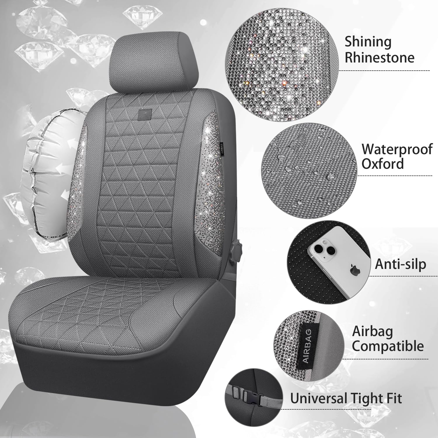 UNIVERSAL SPARKLY DIAMOND: Refresh your car if you install the bing bling crystal diamond nylon gray oxford seat covers, water Resistant oxford material. Surface rhombic texture design, lining sponge soft and comfortable. Fit for most SUV Sedan Pickup coupe automobile vehicle seats with adjustable headrests. Can be installed with the detachable headrests