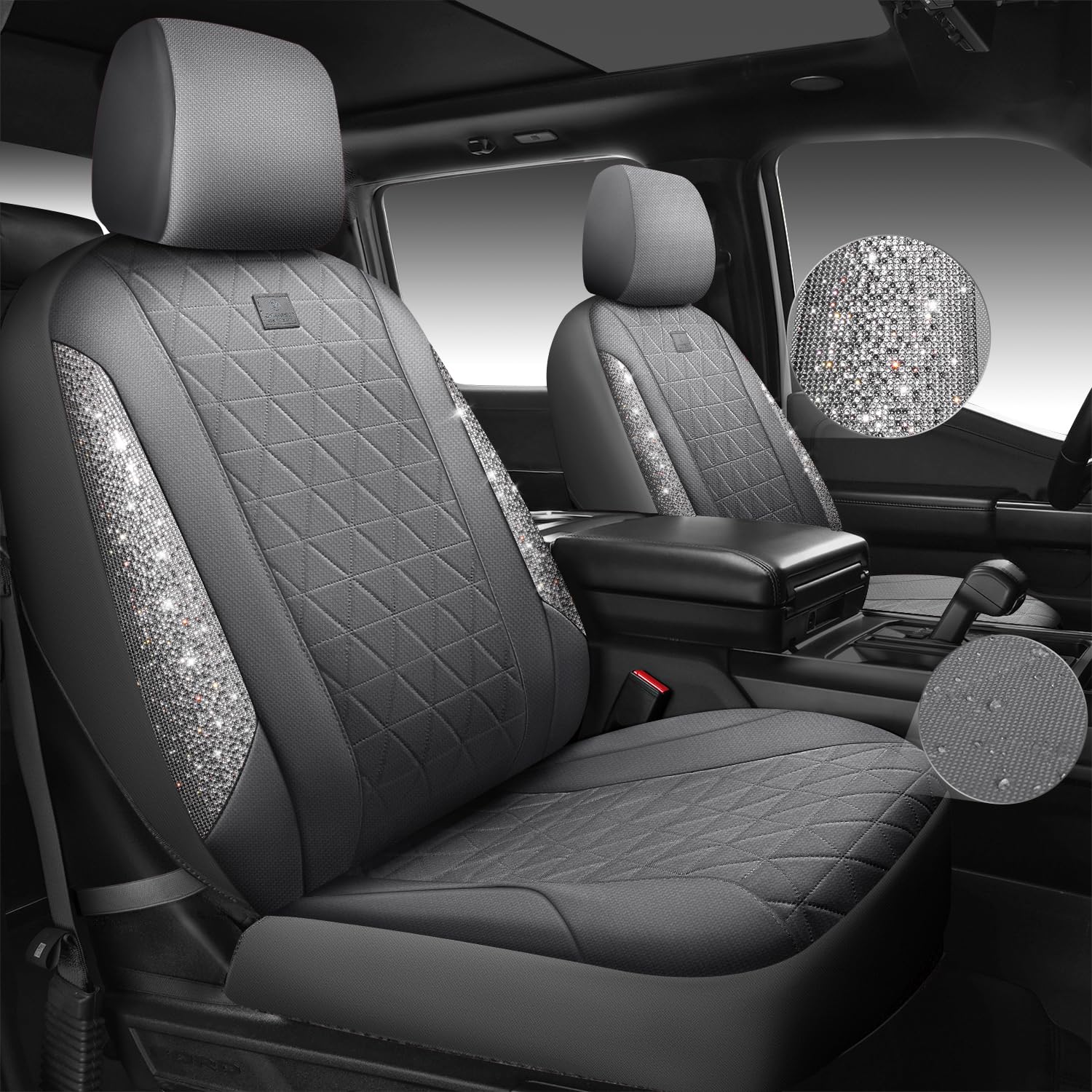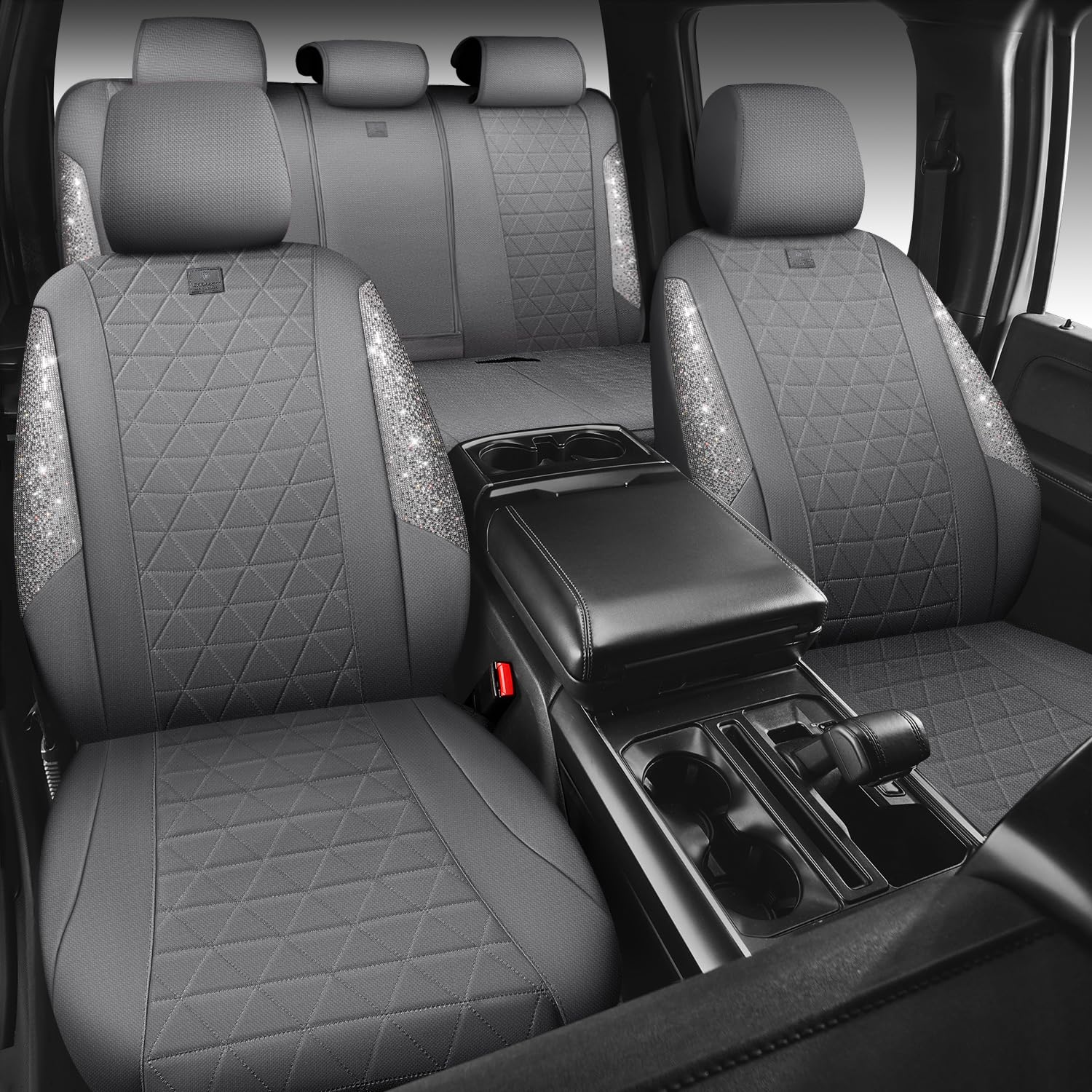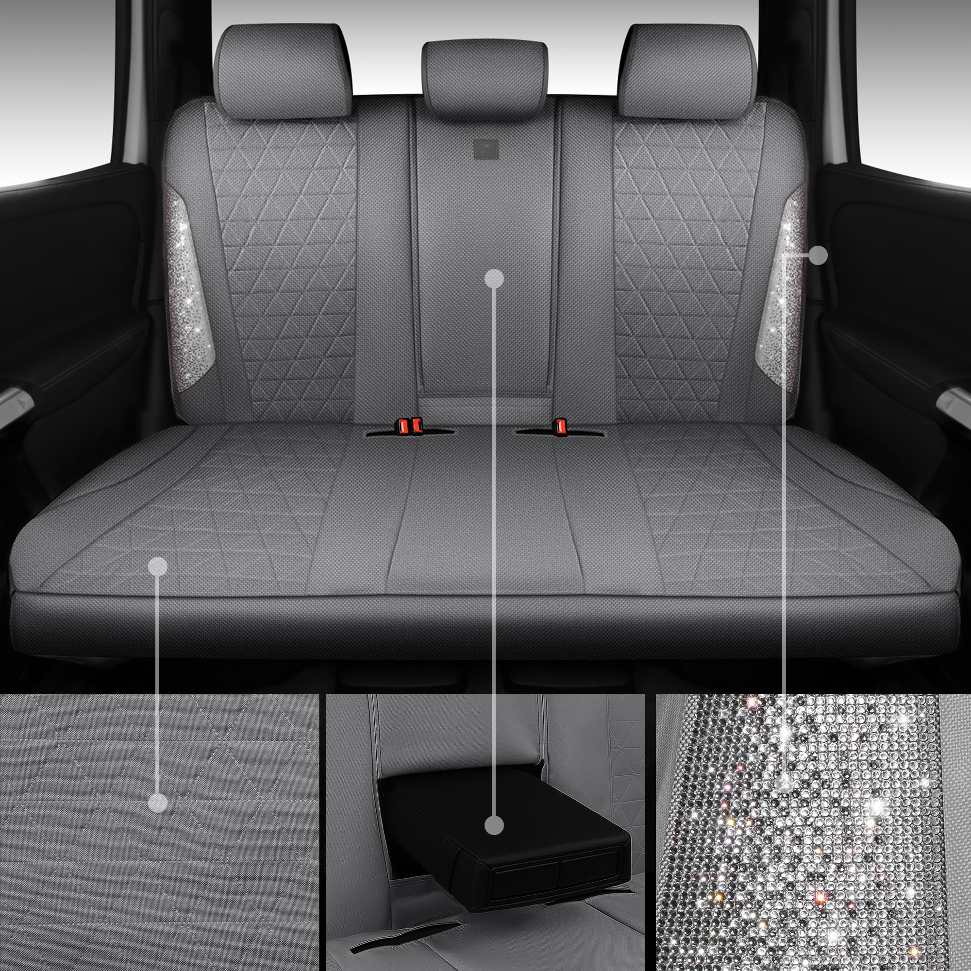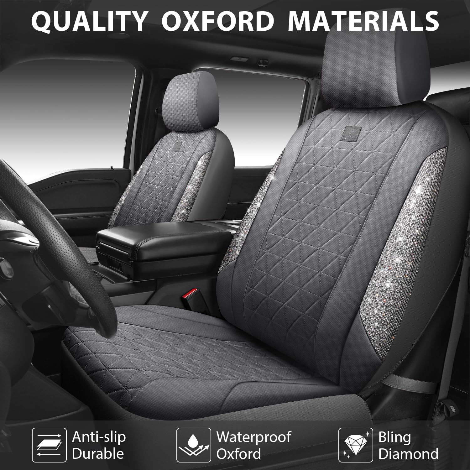 UNIVERSAL SPARKLY DIAMOND: Refresh your car if you install the bing bling crystal diamond nylon gray oxford seat covers, water Resistant oxford material. Surface rhombic texture design, lining sponge soft and comfortable. Fit for most SUV Sedan Pickup coupe automobile vehicle seats with adjustable headrests. Can be installed with the detachable headrests