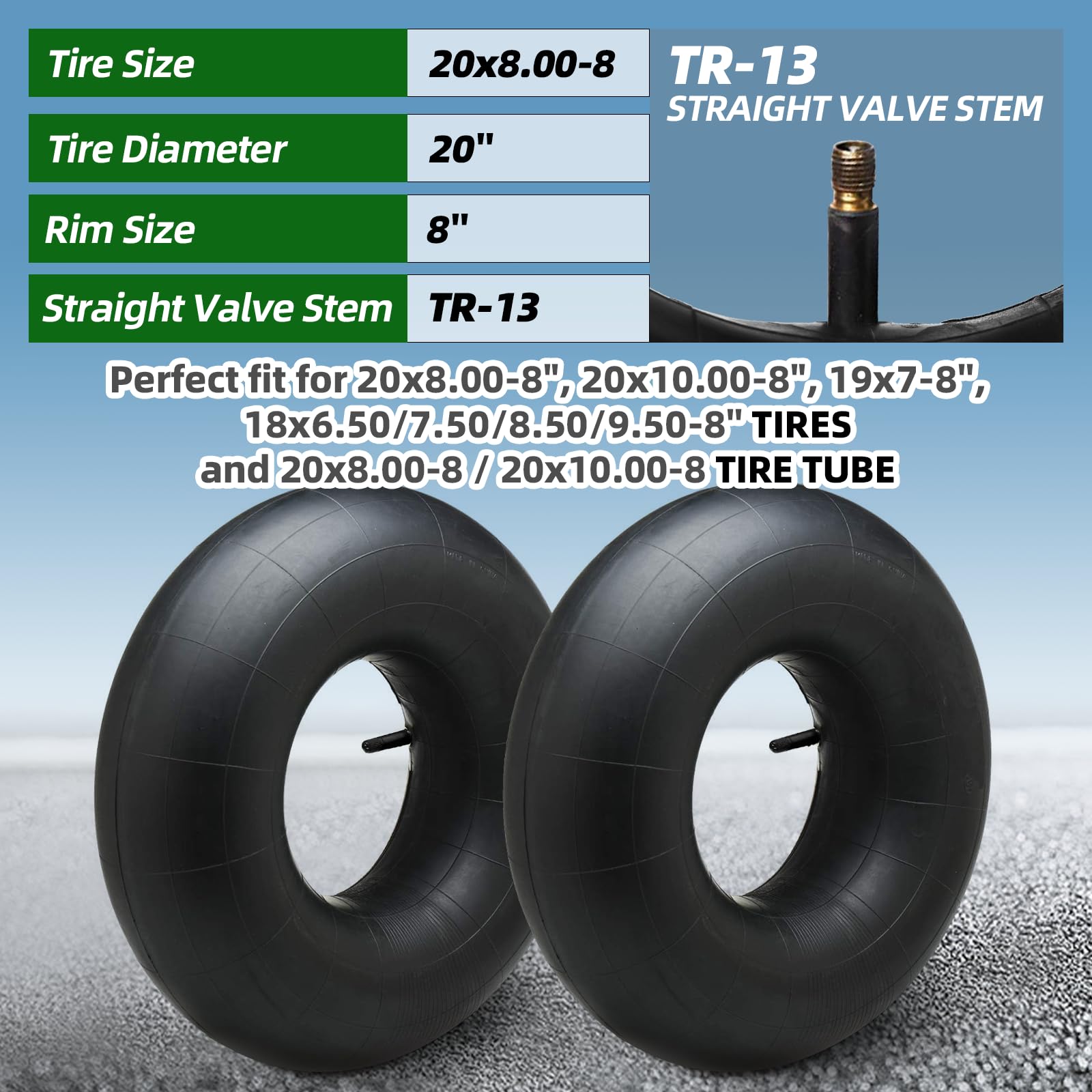 20x8.00-8" TO 20X10.00-8" INNER TUBES WITH TR13 STRAIGHT VALVE STEM - Fits vehicles with an 8-inch rim diameter and a tire width that is between 8 inches to 10 inches. Check your tire's sidewall. If it indicates that your tire size is 20x8.00-8", 20x10.00-8", 19x7-8", 18x6.50/7.50/8.50/9.50-8", then these 2-pack inner tubes are a perfect fit for your tires.