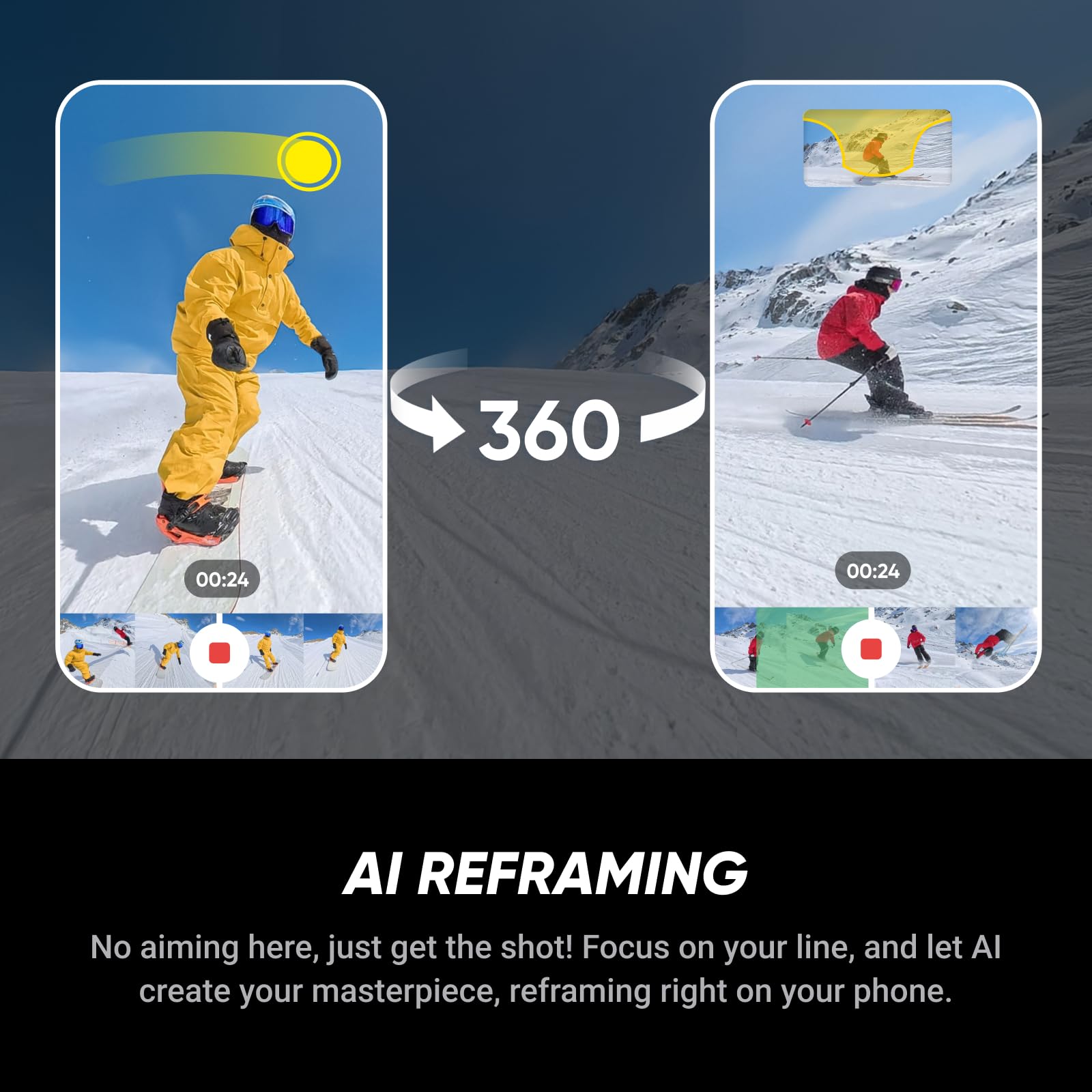 InstaFrame Mode: Get a ready-to-share flat video instantly. Choose auto-framing to let the camera track you, or lock in a fixed angle. Preview the 360° video later to add in any unexpected moments, too.
