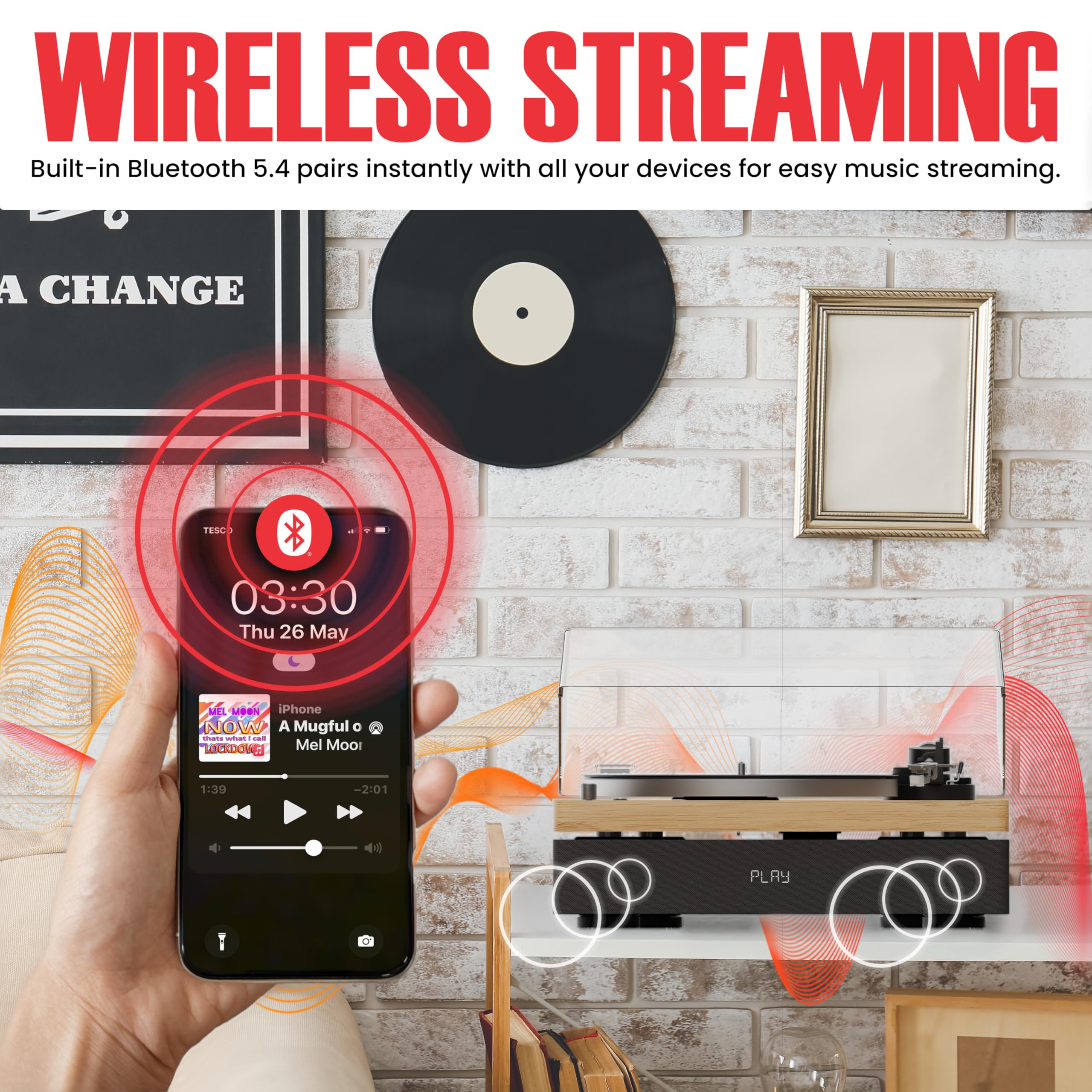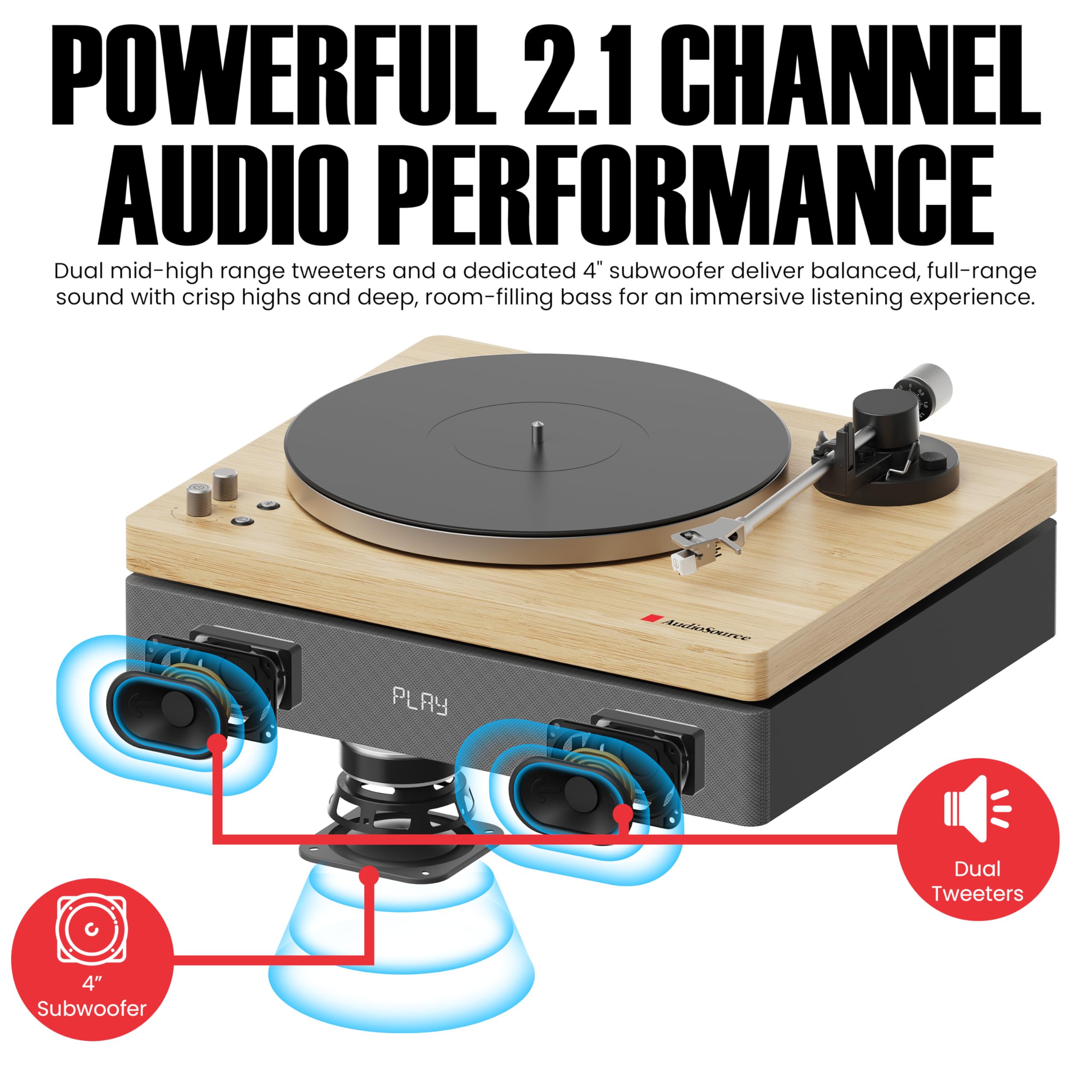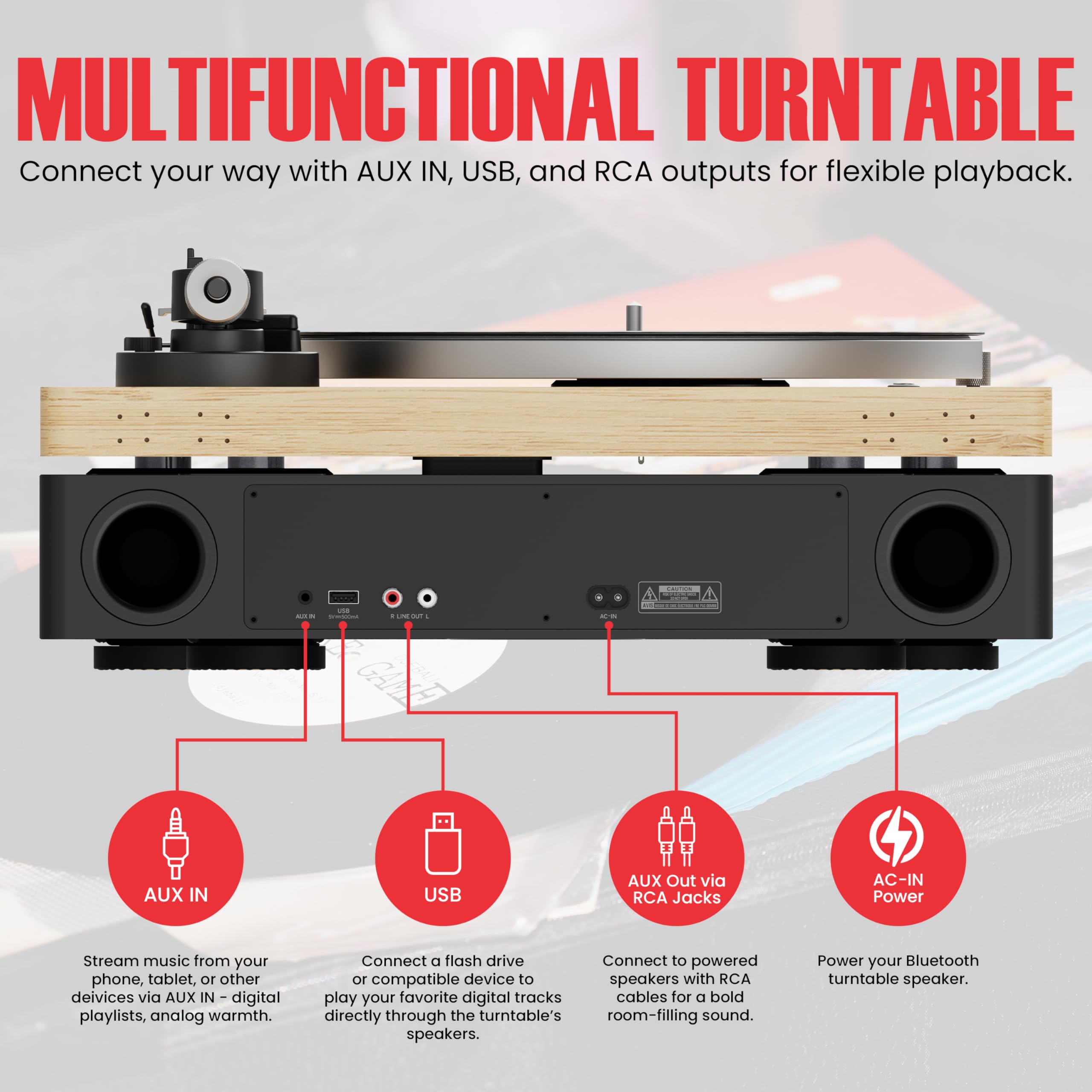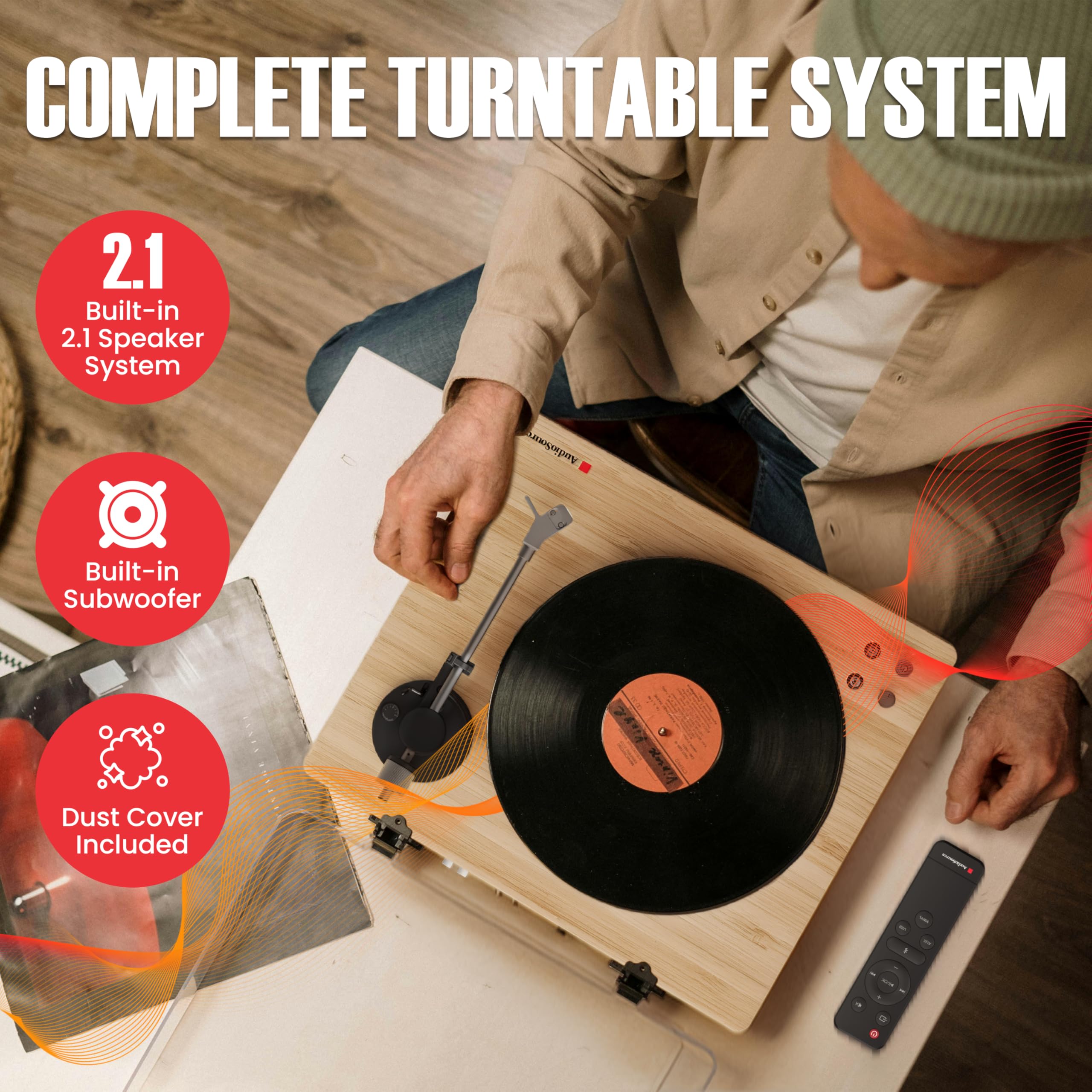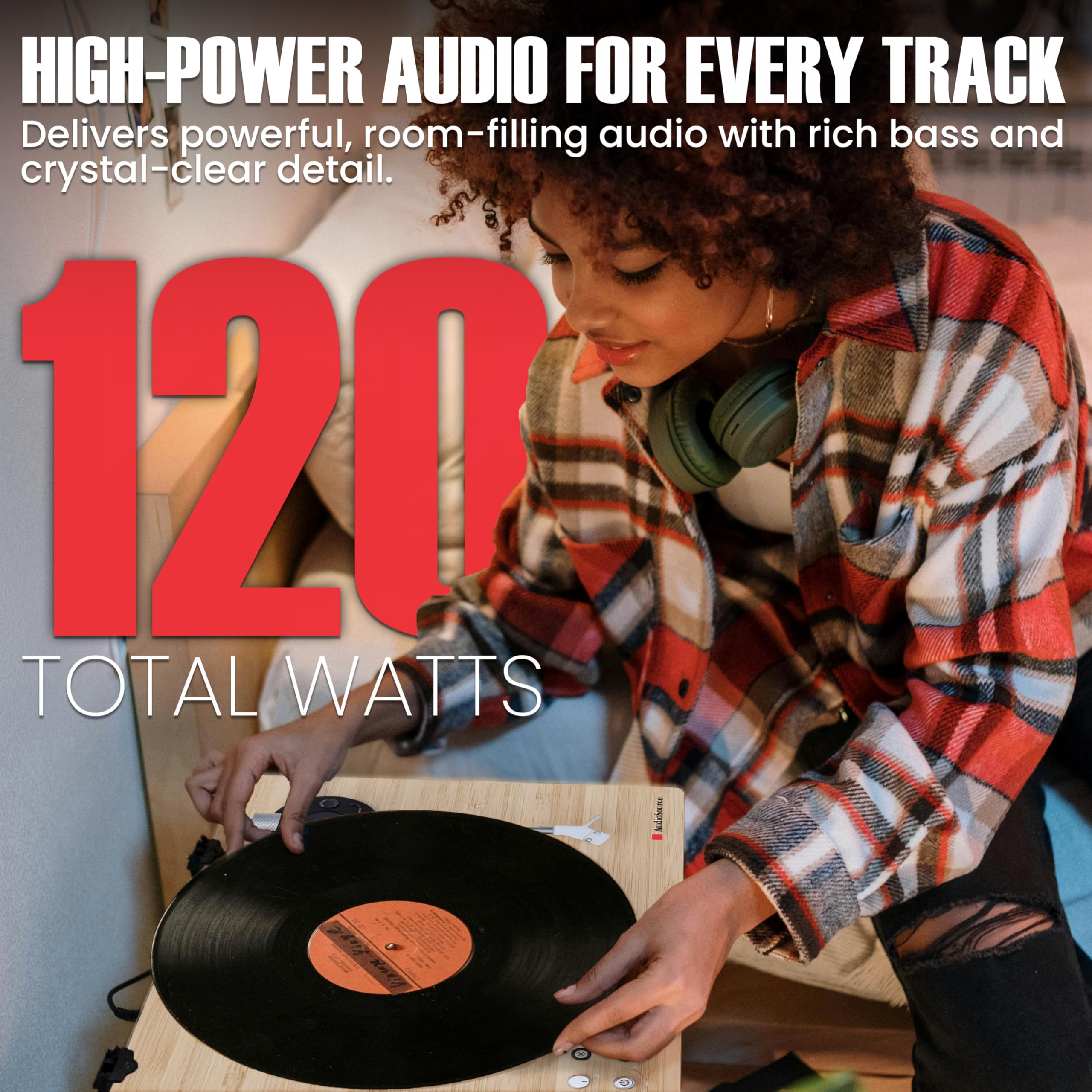 Vinyl Record Player with Built-In 120W 2.1 Speaker - Enjoy full-range sound from stereo drivers and a dedicated down-firing subwoofer in a ported Bass Reflex design, delivering deep bass and warm vinyl tones - no external speakers or amplified required.
