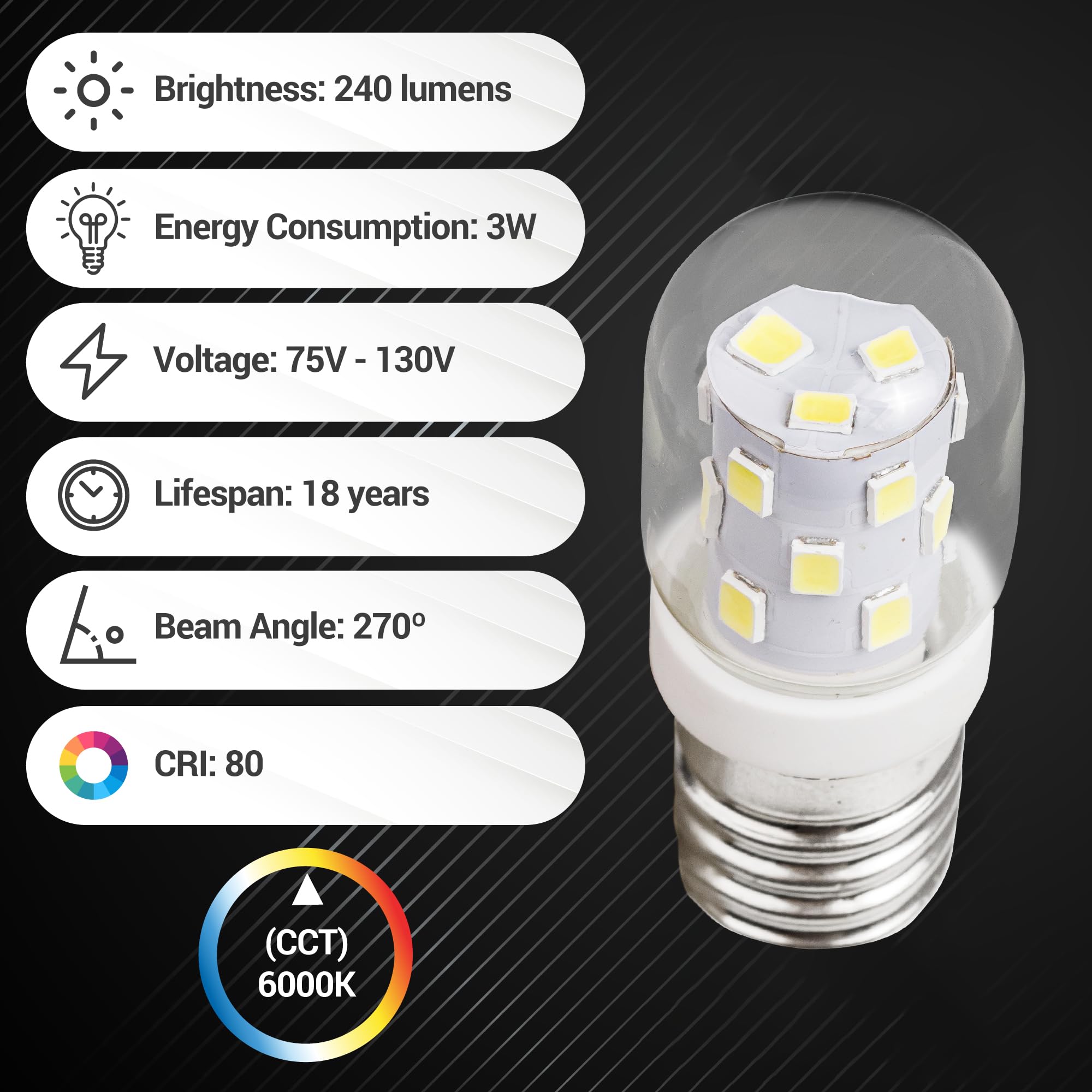 Technical Features: 8206232A Dimmable LED Light Bulb 3W 75V - 130V. Color temperature 6000K. Brightness 240 lumens. CRI 80. 270-degree Beam Angle. No flicker and no buzz. The lifespan of over 18 years. Pack of 2. (The lifespan of the light bulb is 18 years when used for an average of 4 hours per day).
