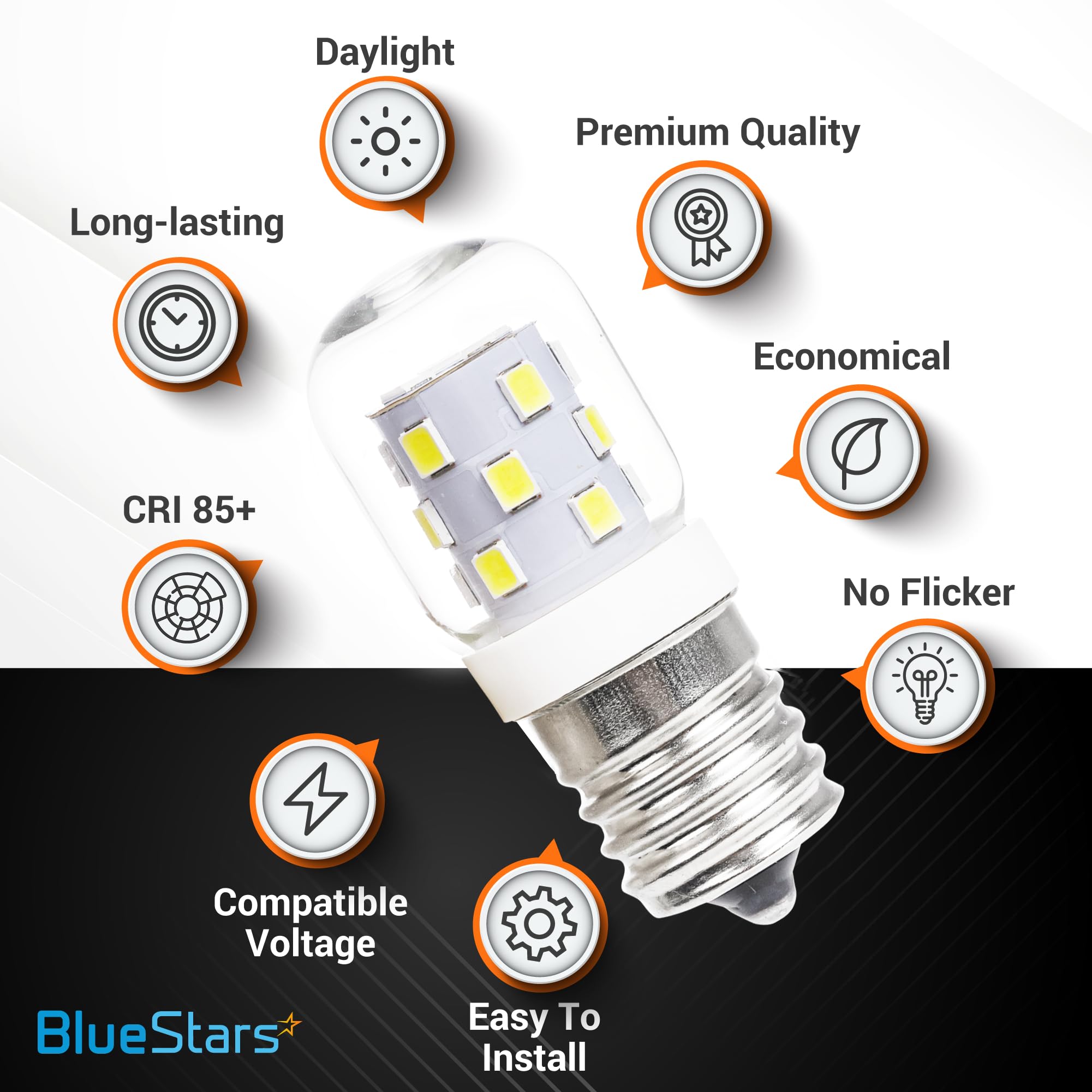 EASY TO INSTALL & WIDE USE: BlueStars 8206232A LED Light Bulb is compatible with an E17 American standard base, it can be easily integrated into any standard E17 lighting fixture. Ideal for homes, offices, and other commercial spaces. Perfect for replacing bulbs in your Refrigerator, Microwave, Oven, or Range Hood, this dynamic lighting solution will make your food look absolutely delectable.
