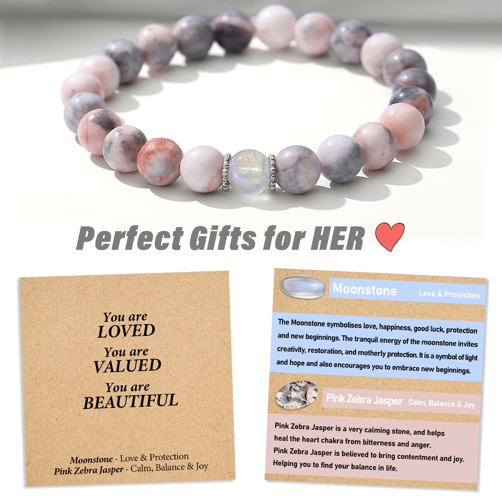 【Gift Ideas for Girls】This handmade bracelet comes with a backing card which features the text "You are loved you are valued you are beautiful". Pink Zebra Jasper can help her find her balance and joy in life. The moonstone is excellent to help purify stress or anxiety, bring her love and protection. This beaded bracelet for girls works great as gifts for sister daughter and best friend, birthday gifts, valentines day gifts for her, Easter gifts for teen girls.