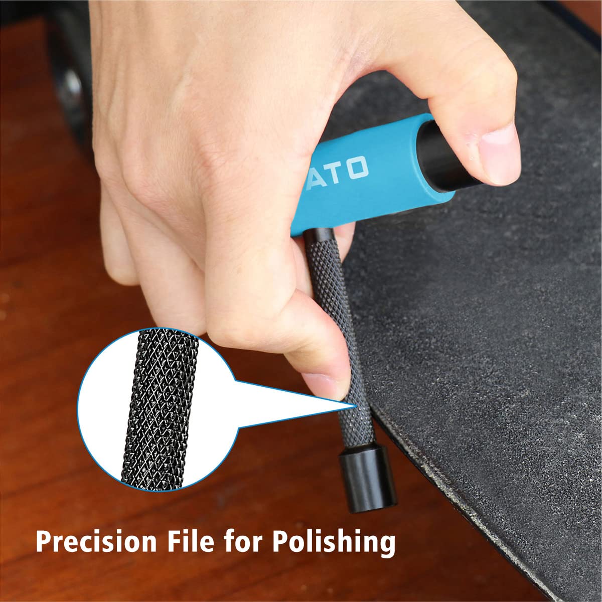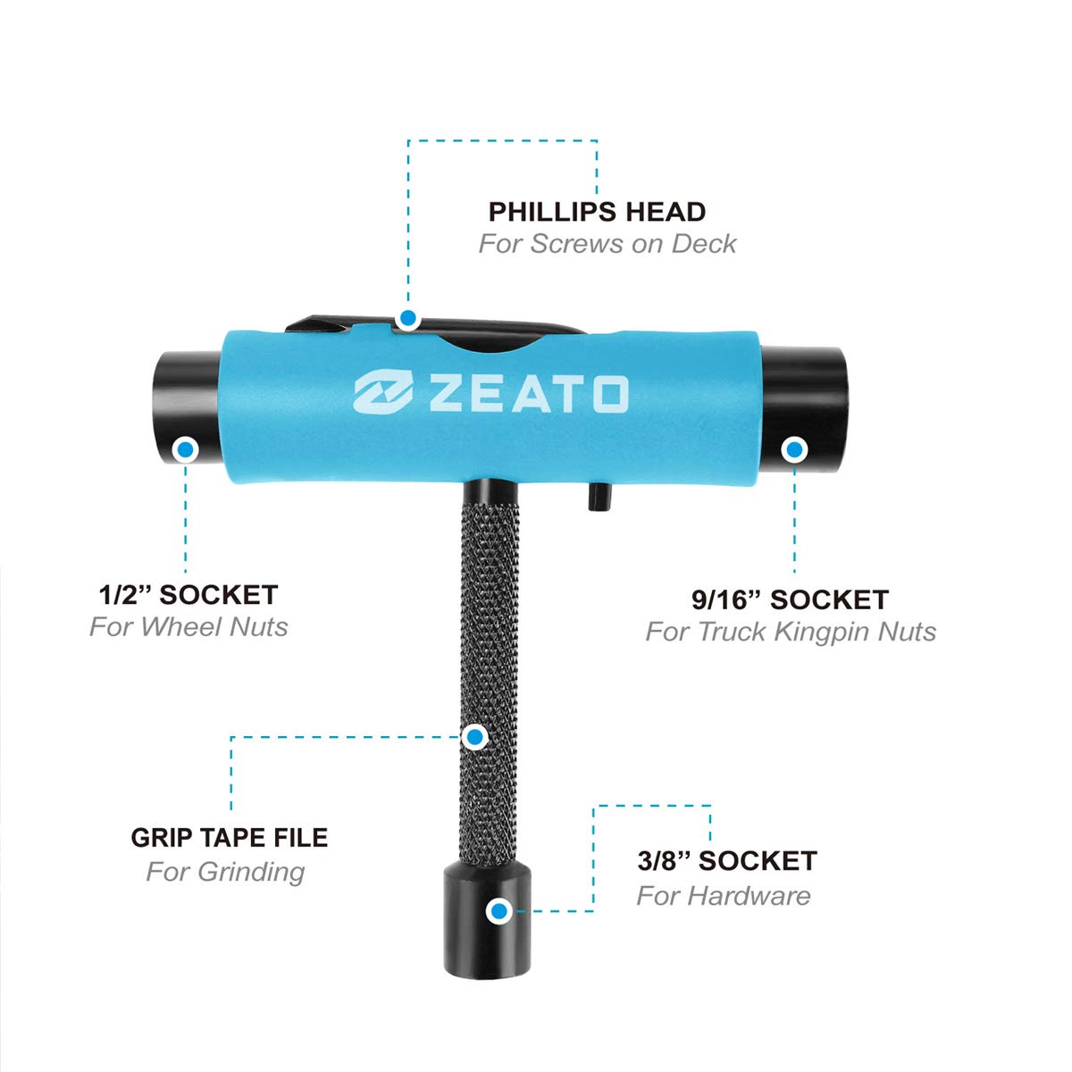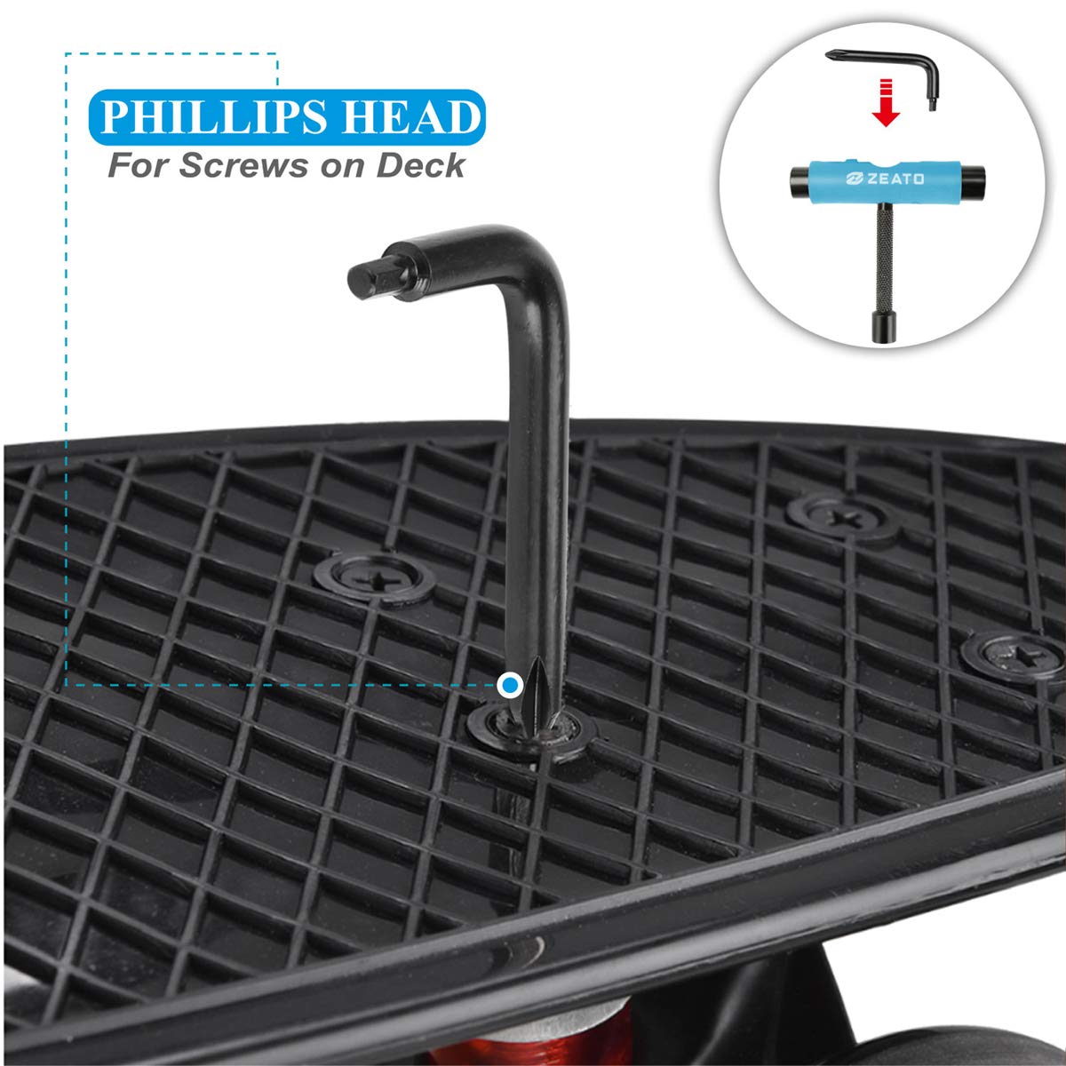 [Innovative Structure]: The skateboard T tool includes 3 different sizes of sockets (1/2'',9/16''and 3/8'') and a slide-out Phillips head wrench screwdriver that fits into the middle of the handle when not in use; It has grip tape file for grinding the surface of deck as well
