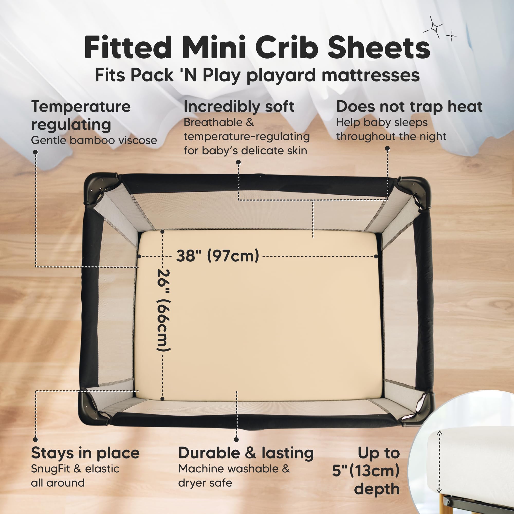 2-Pack Fitted Mini Crib Sheets - Sized at 38” x 26”, each Isla Mini Crib Sheet Set comes with 2 fitted pack and play sheets that fit most pack n play mattresses, portable play pens, and mini crib mattresses with a height of up to 5".