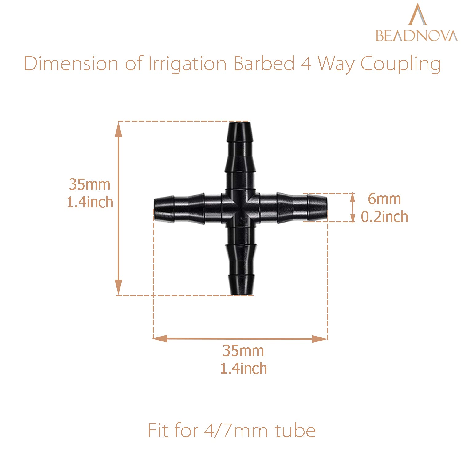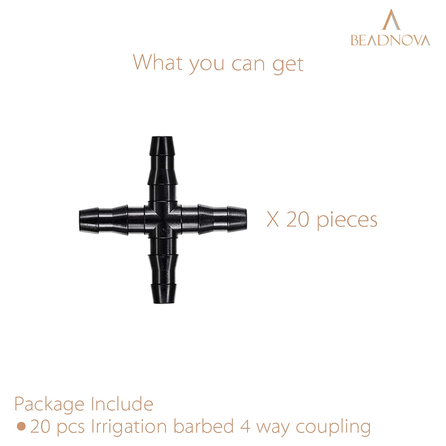 BEADNOVA Drip Irrigation Connectors 20 Pcs 1/4 Inch Barbed Connector 4 Way Couplings Irrigation Connectors for 1/4 Inch Drip Tubing Water Tubing Gardening Irrigation Supplies (20pcs) About BEADNOVA BEADNOVA - Bead and Nova, a bright star in beading and jewelry making industry. Founded in 2013, with nowadays hundreds of products exporting globally, BEADNOVA has been growing substantially to become one of the top sellers in jewelry making category on major online shop platforms in the States. Wide varieties and attention to quality, BEADNOVAs mission is to offer the easiest assembled combinations, accessible and affordable materials for jewelry making lovers. What makes us outstanding is that our dedication and passion to customer service. Things grow naturally without repeat. Every leaf, every pattern is unique. BEADNOVAs elements make a unique presence, with your soul and spirit BEADNOVA, Create Your Jewelry. Kindly Note: 1.Since the size above is measured by hand, the size of the actual item you received could be slight different from the size above. 2.Due to lighting effects, monitor's brightness/contrast settings etc, there could be some slight differences in the color tone of the pictures and the actual item.