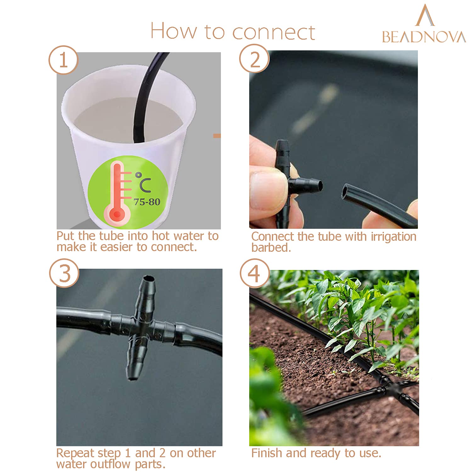 NO TOOL INSTALLATION: Connect irrigation tubing by simply insert this barbed connector at the ends of the tube. No tools or glue required. Push the tube firmly into the irrigation barbed to avoid leakage. Soften the end of tube with blower if you find the tube is too stiff before inserting.