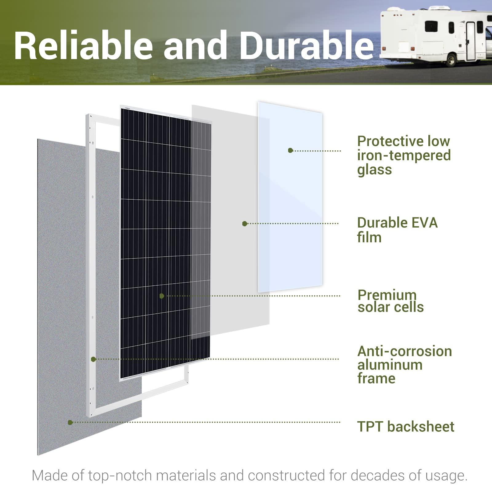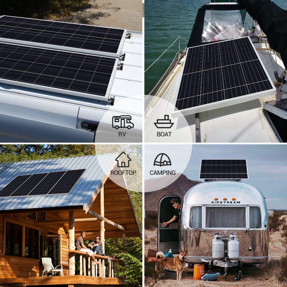 【High Efficiency】High module conversion efficiency. Bypass diodes minimize power drop caused by shade and ensure excellent performance in low-light environments. Monocrystalline panels come with high-efficiency solar cells that help increase space efficiency.