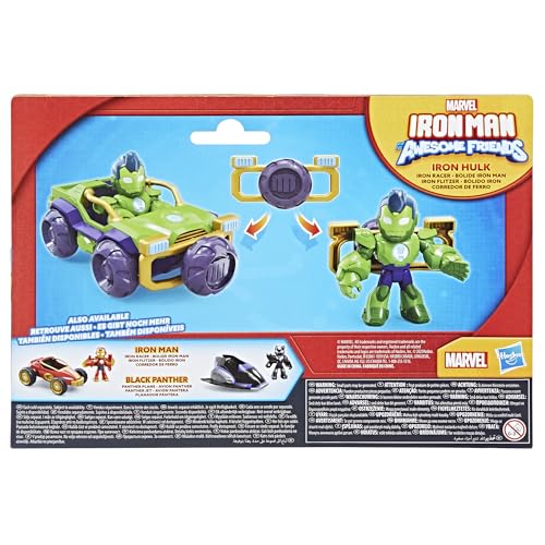 Join Team Iron Man on the latest adventures with this Iron Hulk Iron Racer figure & car 2-pack! This 3-inch (7.6 cm) vehicle toy comes with a poseable Iron Hulk that fits inside. Imagine speeding into action to save the day or remove the detachable 2-in-1 spoiler accessory from the vehicle, attach it to the figure’s back to armor up, and pretend to smash into adventure. Encourage big, imaginative, adventure play for kids ages 3 & up with these Marvel toys for boys and girls! Look for even more Iron Man and His Awesome Friends toys, including Iron Man with Iron Racer race car toy and Black Panther with Panther Plane airplane toy, as well as playsets and accessories, to build a Super Hero collection or give as cool Marvel gifts for preschool kids! (Each sold separately. Subject to availability.) Copyright MARVEL. All trademarks and registered trademarks are the property of their respective owners. HASBRO and all related trademarks and logos are trademarks of Hasbro, Inc.
