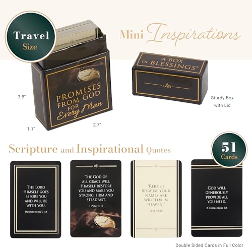 Keep God's Word close when you place the Promises From God For Every Man Box of Blessings in your car console, desk, or backpack βdivine wisdom only an arm's reach away. The black box and lid are edged in eye-catching gold foil frames that draw the eye to an image of a gold watch that sits as the background to the shining gold-foiled title. Promises From God For Every Man The cards cycle through six designs with a cream and black color scheme. Each of the 51 double-sided cards features a Scripture promise, blessing, or encouragement. The cards are about the size of a deck of cards and are printed in full color. The cards in the Promises From God For Every Man Box of Blessings will help every husband, father, stepfather, uncle, nephew, or son in your life enhance their relationship with God! The Promises From God For Every Man is perfect to present at men's meetings or as a Father's Day treat at your church. Black background with golden wristwatch design Gold-foiled title Full-color printed cards and box 51 double-sided cards Cream and black color scheme Scripture on both sides Shrink-wrapped Sturdy box with lid Card size: 3.4" x 2.3" (86 x 58mm) Box size: 3.8" x 2.7" x 1.1" (97 x 69 x 28mm)