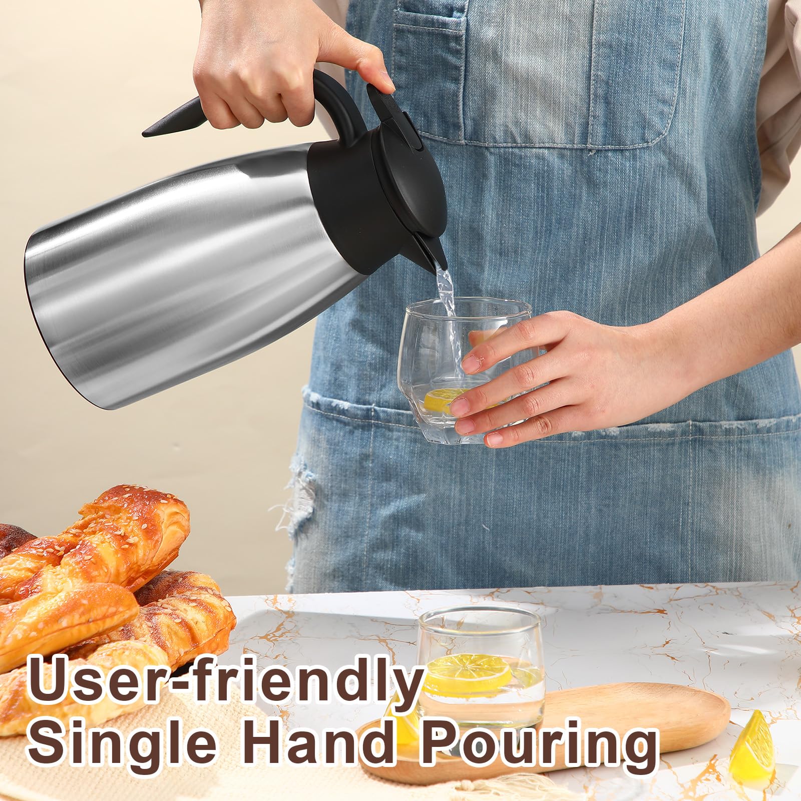 Use with Ease: the double walled hot water carafe is thoughtfully designed with a bent handle, easy and comfortable to grip and hold, and they are not easy to leak, you can just push the button to open the pour spout, making it a breeze to pour with single hand
