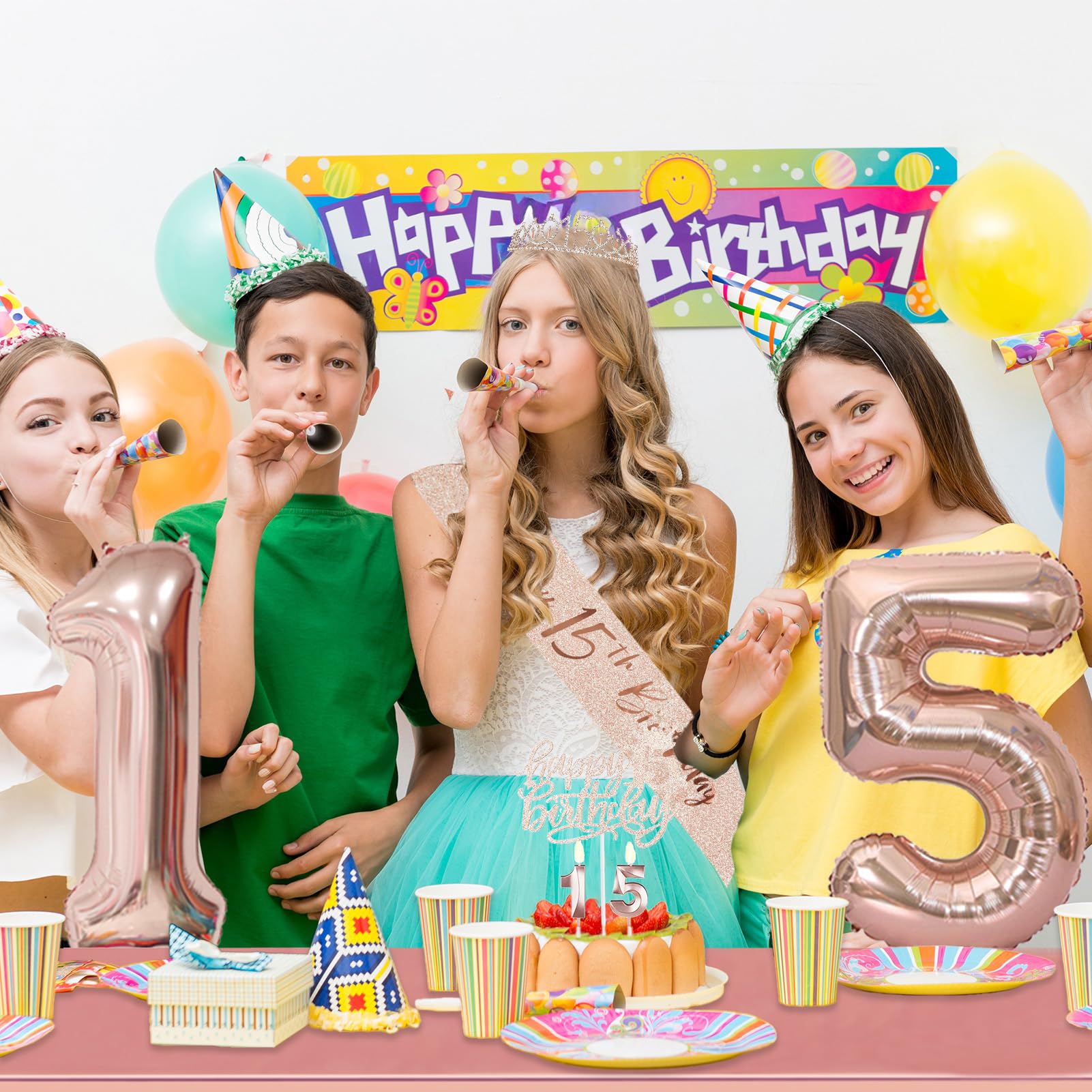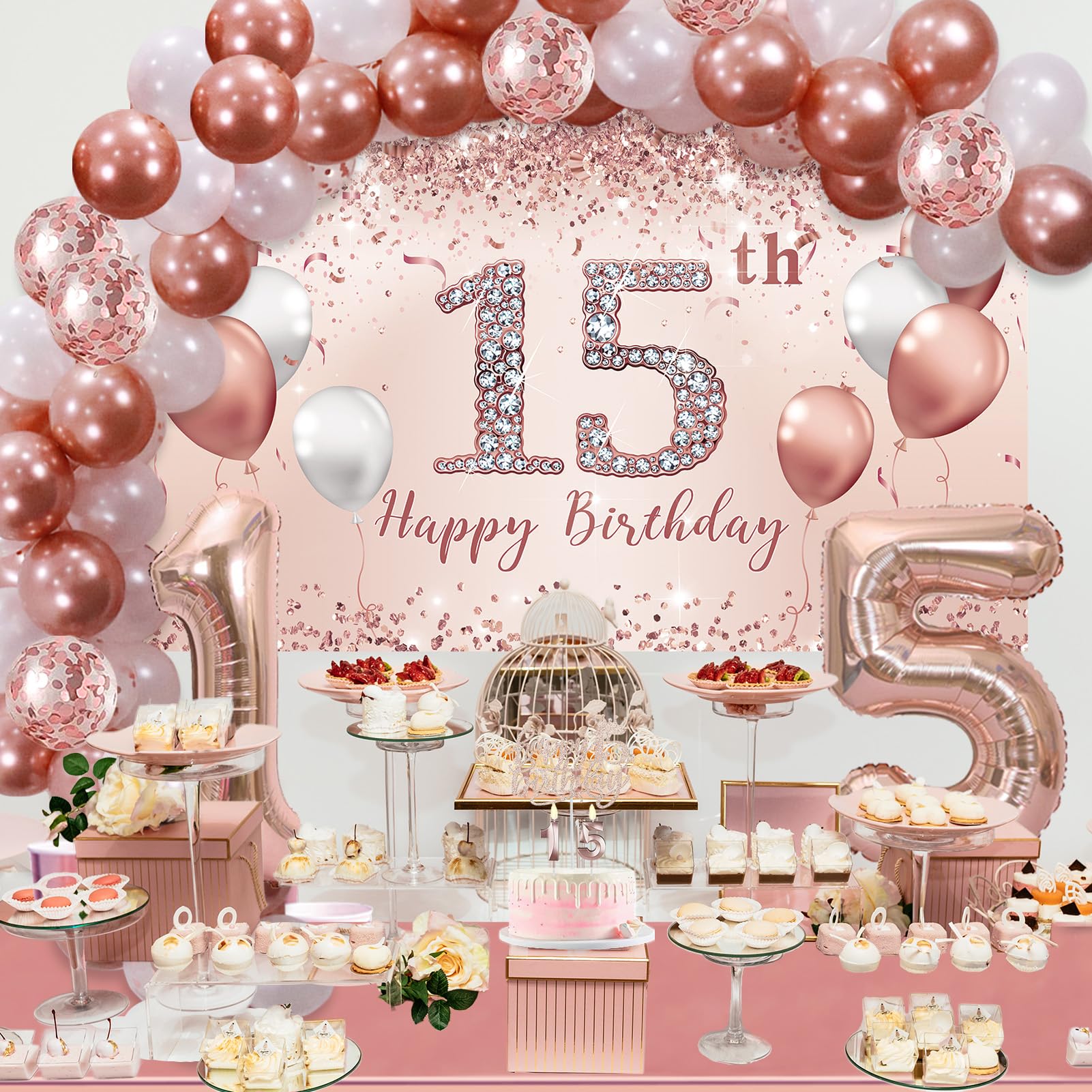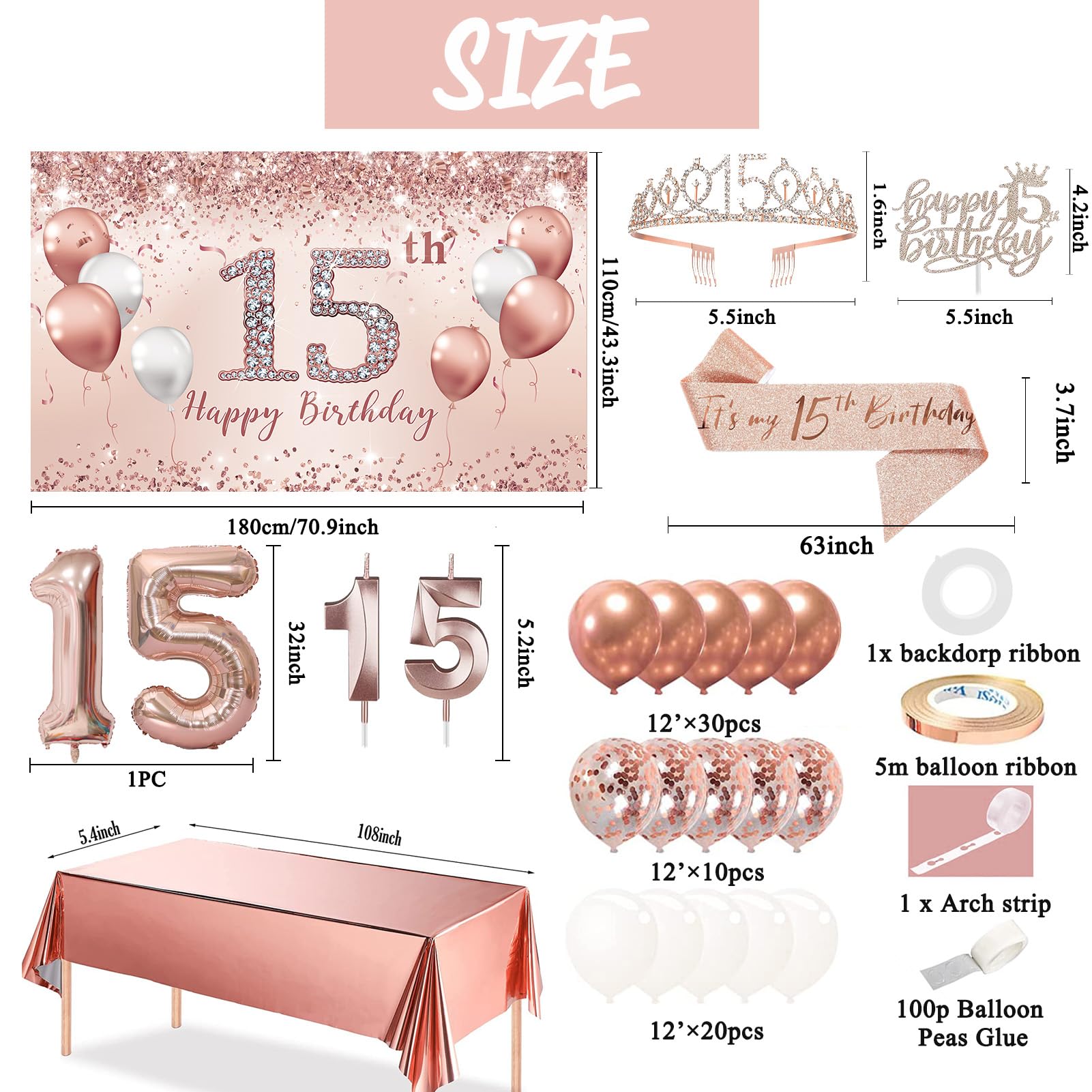 [15th Birthday] Package IncludedοΌ1pc 15th party banner, 1pc pink 15birthday crown, 1pc sash and a pearl pin, 1pc happy 15th birthday cake topper, number 15 balloons 32inches, 1pc rose gold tablecloth.and 60 latex balloons The 15th birthday decoration set will heighten the excitement of the girlss 15th birthday party.