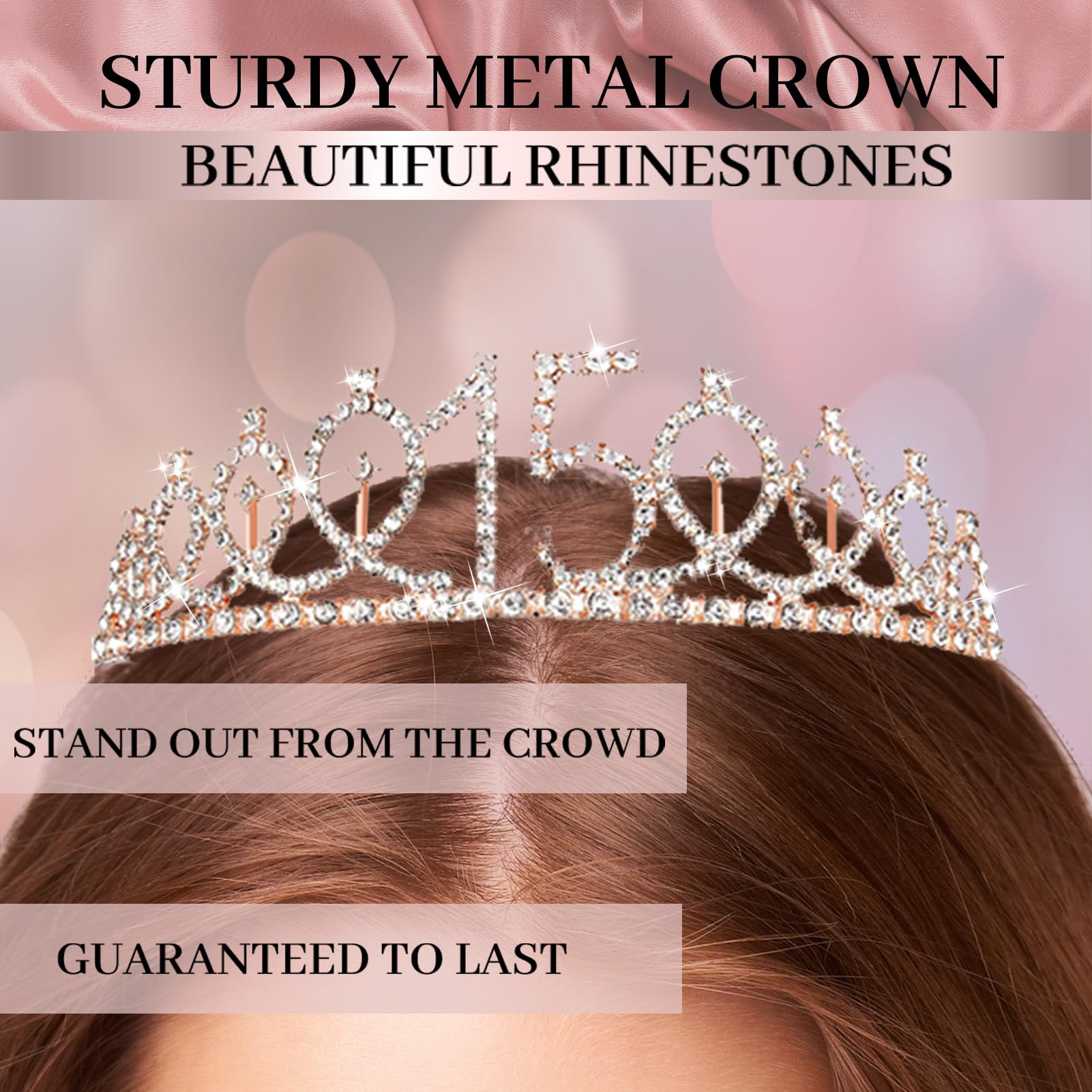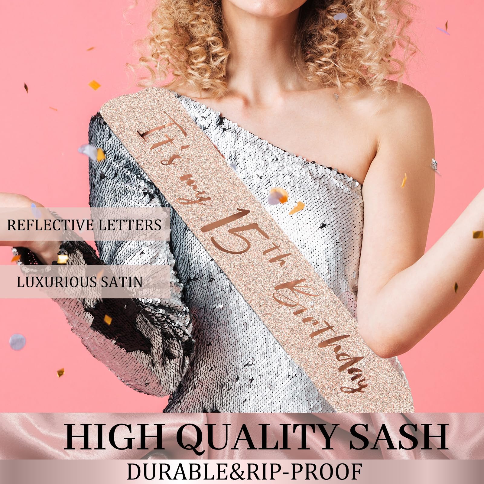 [15th Sash for girls] The rose gold birthday sash is made from high quality glitter fabric and printed with rose gold foil words. Elegant and gorgeous! The sash is in 63inch length and comes with a pretty pearl pin. You can adjust the length by using the pearl pin in the package. Th pin also put the perfect finishing touch on your party outfit.