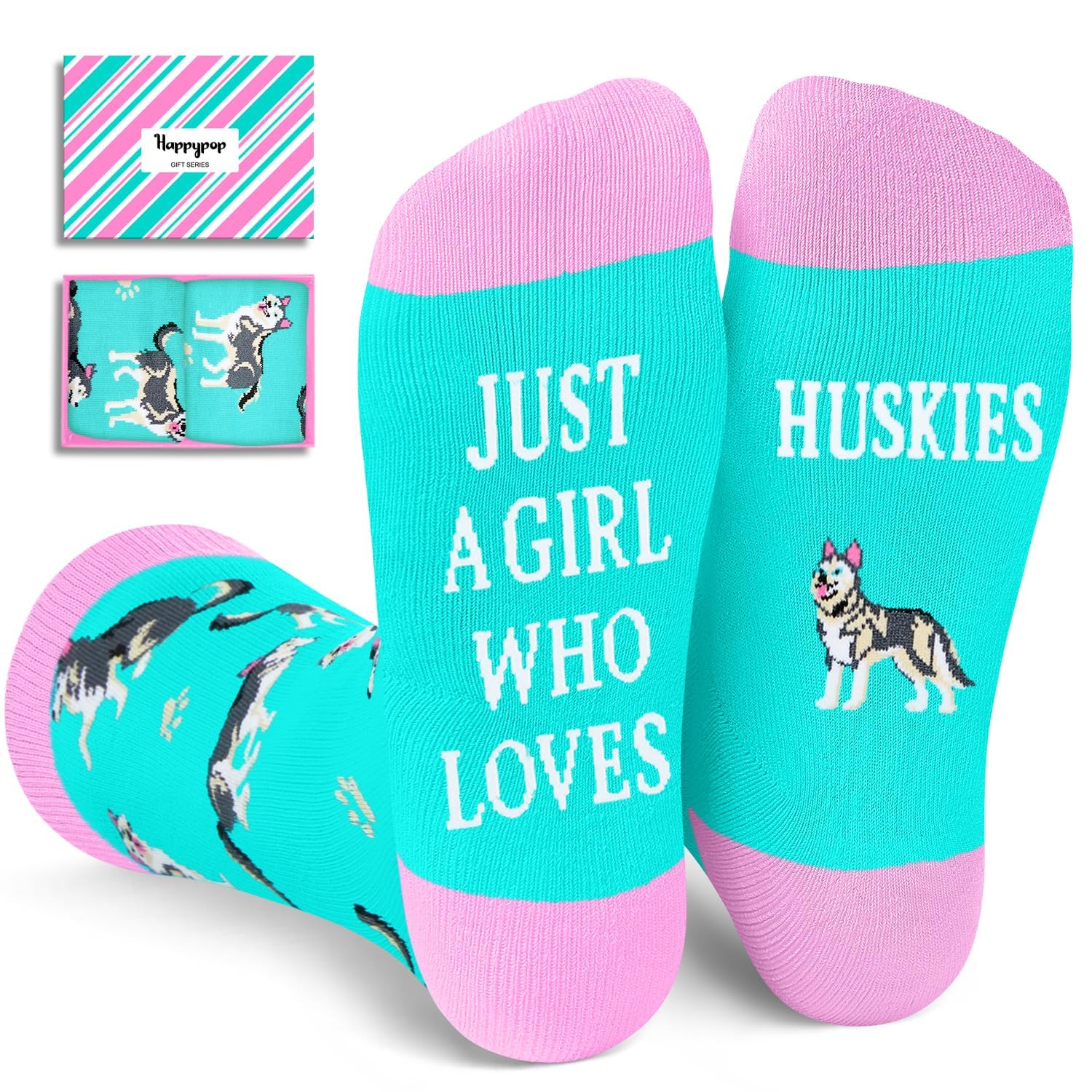 HUSKY SOCKS: Our whimsical women's blue socks are adorned with adorable husky and paw prints, with funny sayings "JUST A GIRL WHO LOVES HUSKIES".