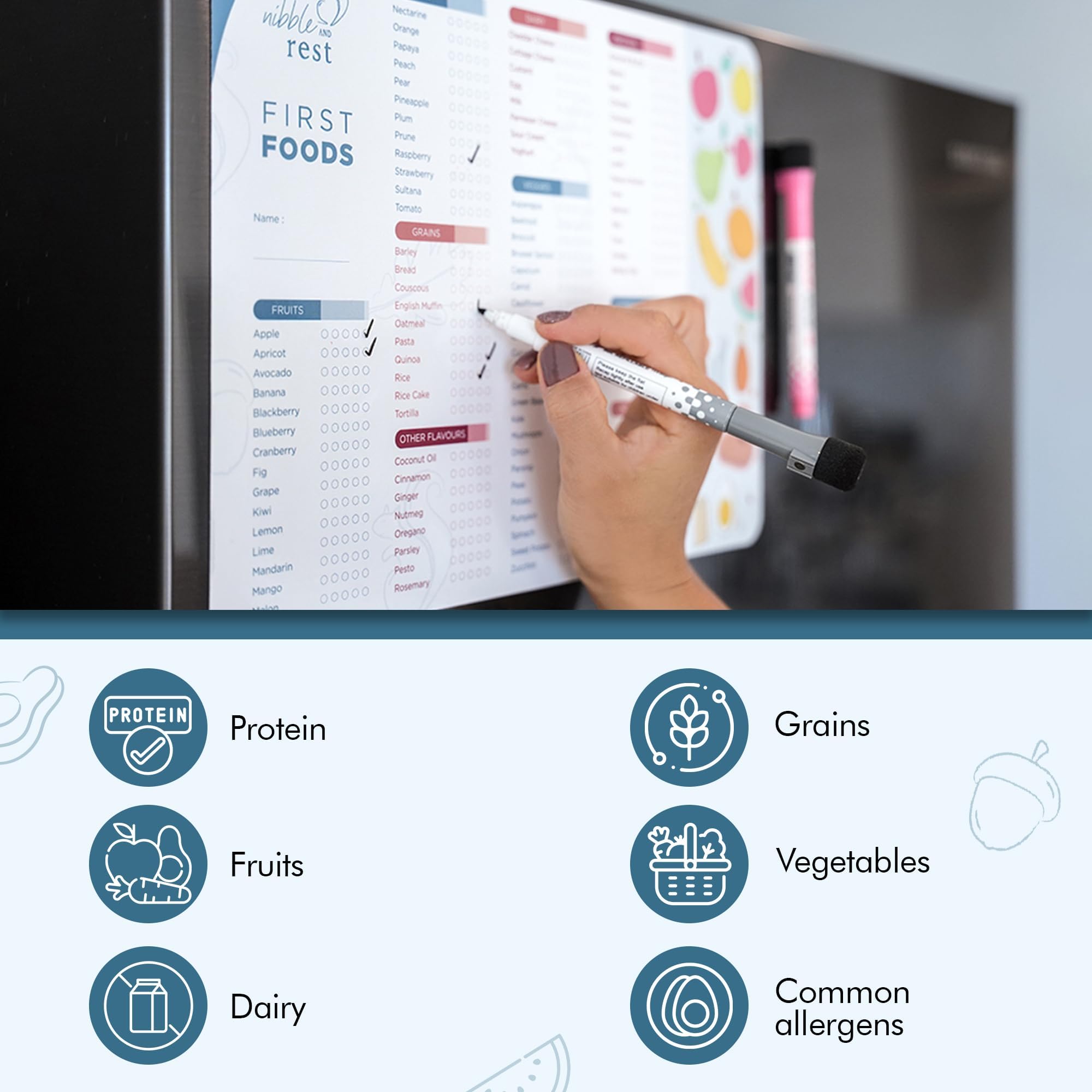 BABY'S FIRST FOOD CHECKLIST: Our large fridge magnet is perfect for tracking your baby's food journey as they try new foods for the first time. You can easily plan each meal while introducing your baby to an assortment of flavors to help minimize picky eating