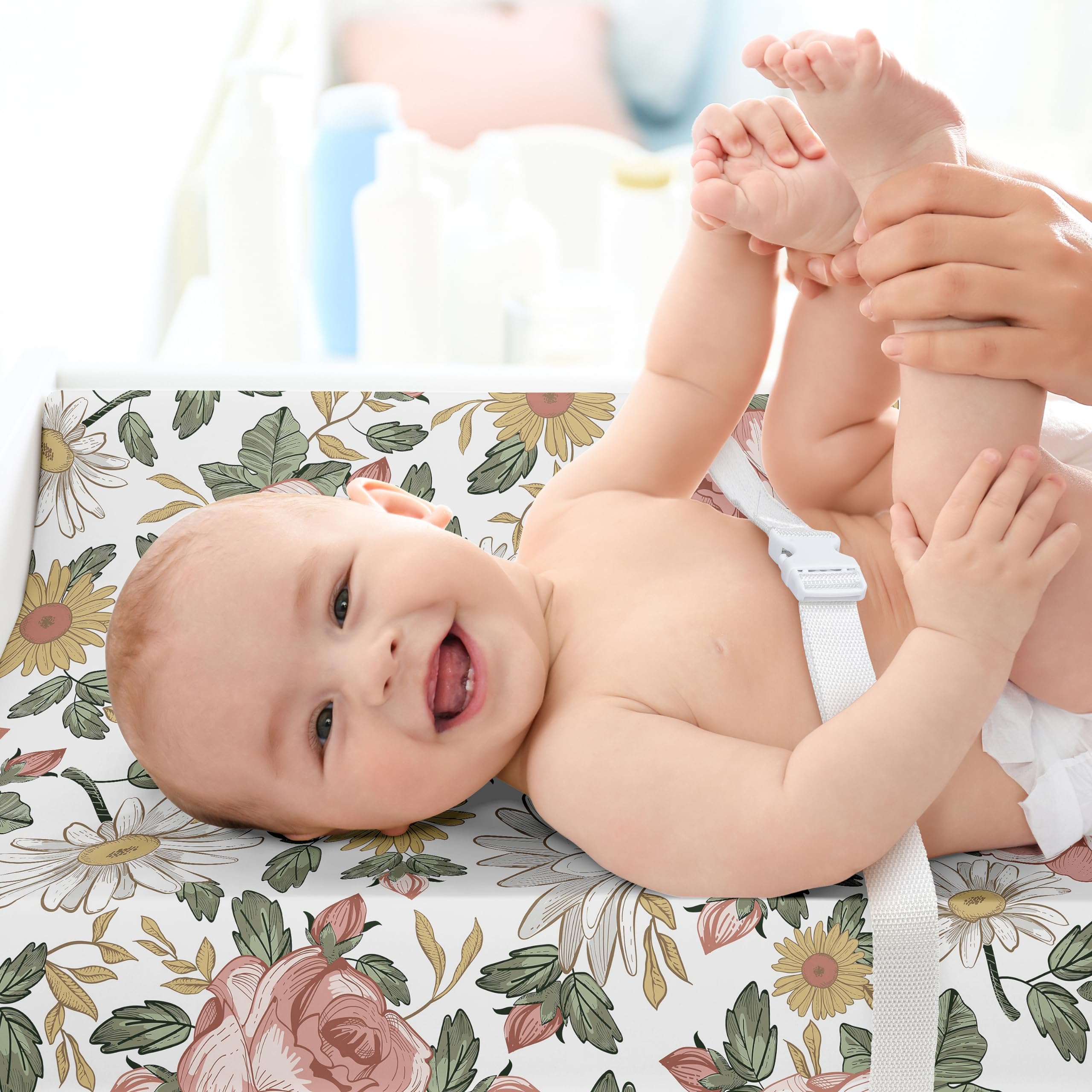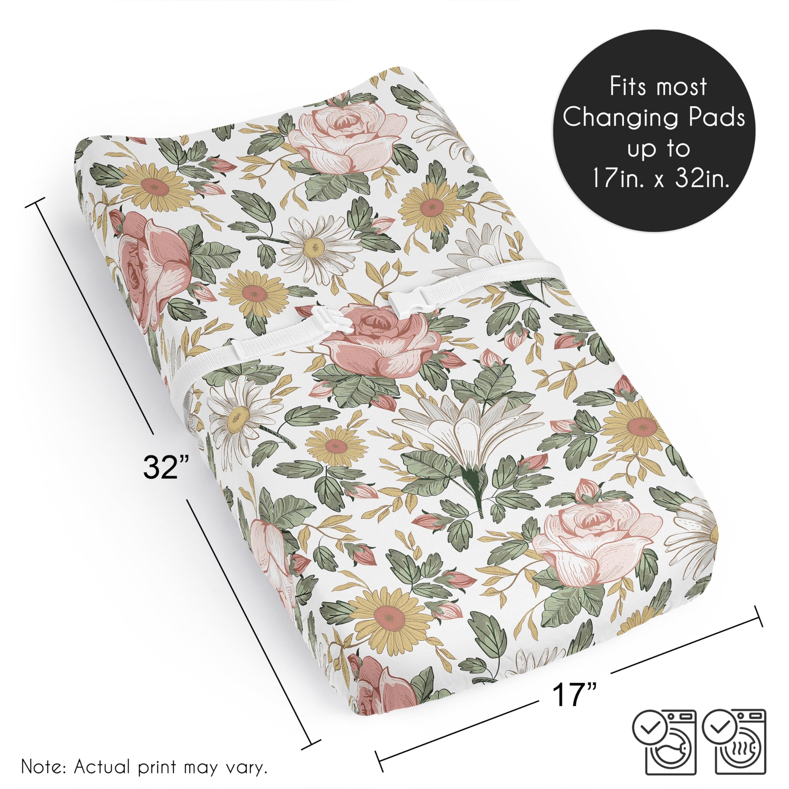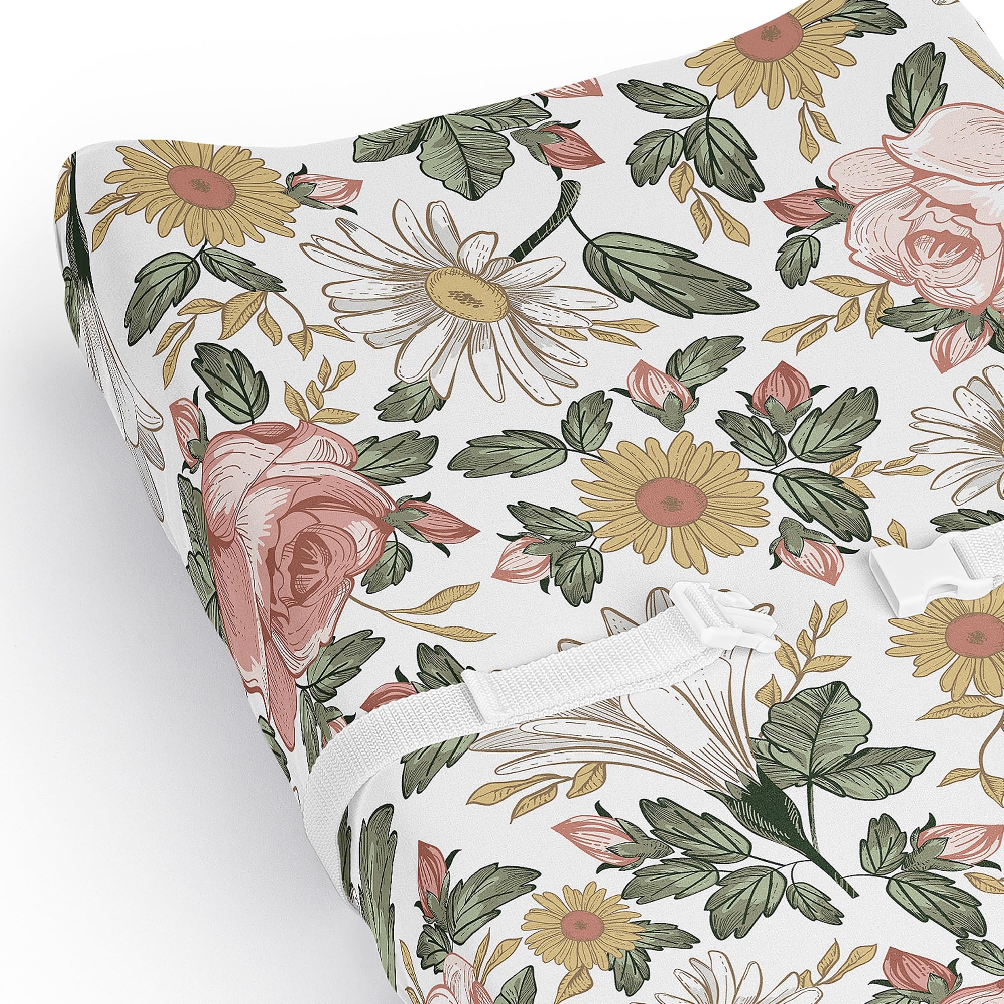 This brushed microfiber diaper pad cover sheet features an exclusive design of blush pink, yellow, sage green and white shabby chic vintage leaf flower boho watercolor rose daisy floral bohemian farmhouse wildflowers print for the Vintage Floral Collection.